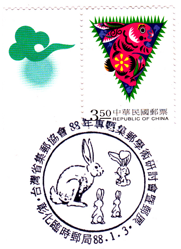 Diese Marke aus China Taiwan (MiNr 2493yA) zum Jahr des Hasen bildet im Markenbild einen Hasen im Dreieck ab. Der Sonderstempel zeigt ebenfalls vier schöne Hasenbilder.