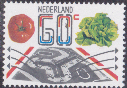In einer Serie "Export industrieller und landwirtschaftlicher Produkte" aus den Niederlande erschien diese Marke (MiNr 1191) mit einer Tomate, einem Salatkopf und einem Flughafen.