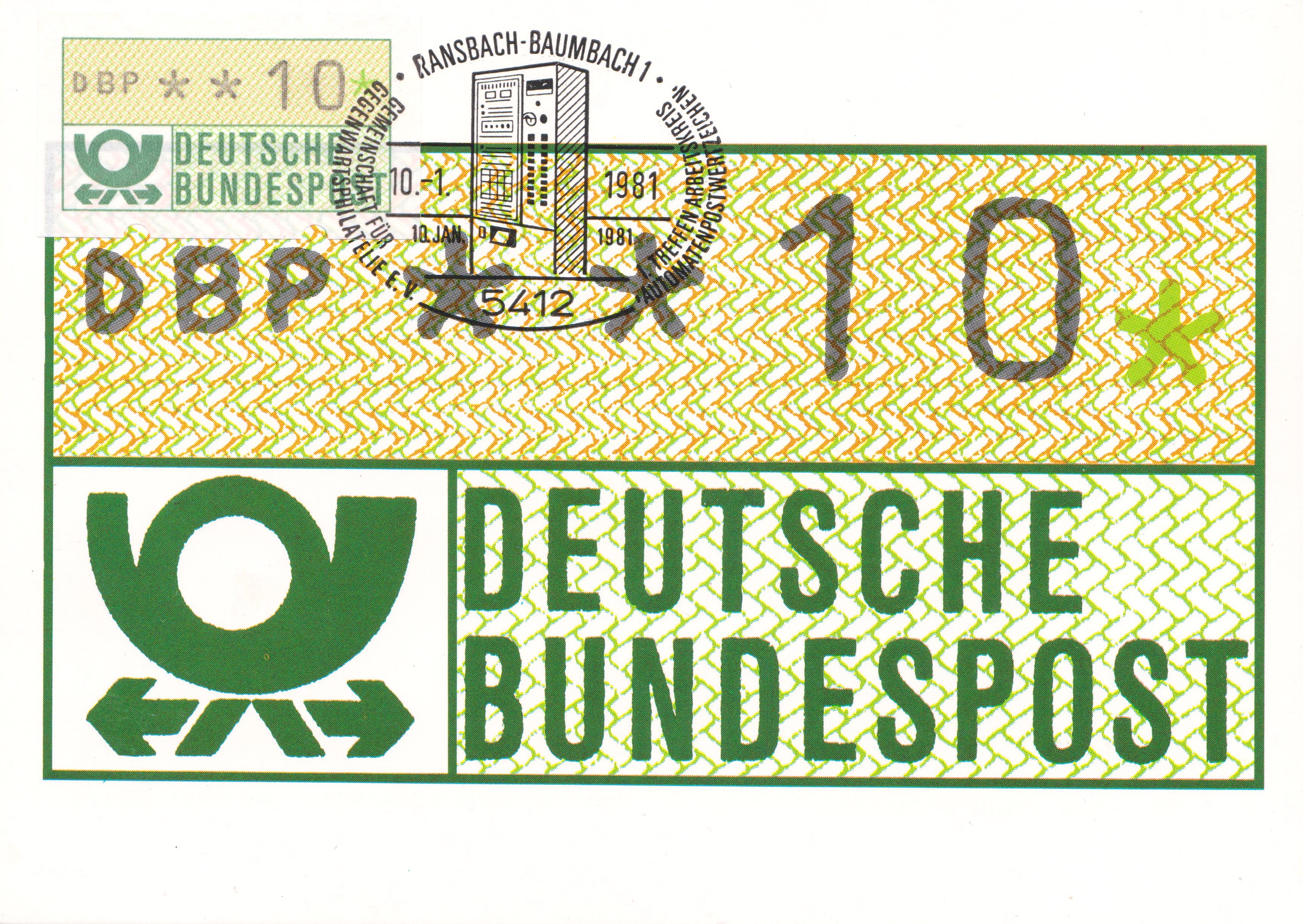 ATM MiNr. 1.1 hu der Wertstufe 10 (Pf) am 10.01.1981 auf einer Maximumkarte "A 1":