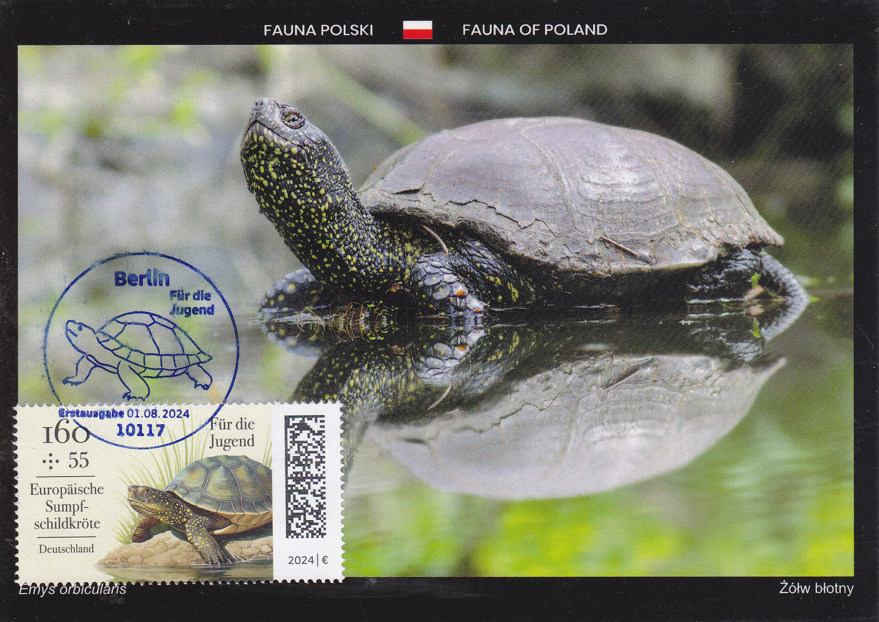 Maximumkarte mit der Jugendmarke 2024 zu 160+55 Cent (MiNr 3845) mit einer Europäische Sumpfschildkröte (Emys orbicularis) und dem dazu passenden Ersttagsonderstempel aus Berlin.