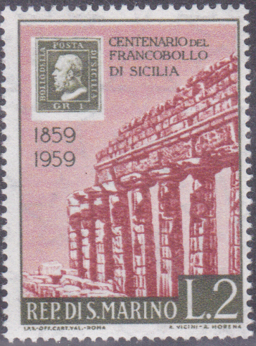In der gleichen Serie "100 Jahre Briefmarken von Sizilien" aus San Marino erschien diese Marke (MiNr 628) mit dem Tempel von Selinunt und der Marke Sizilien MiNr. 2.