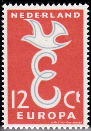 In den Niederlande erschienen am 13.9.1958 die Europamarken 1958 mit dem Gemeinschaftsmotiv "Stilisierte Taube über Buchstabe „E“". Hier der Wert zu 12 Cent orangerot/hellkobalt, der in einer Auflage von 48 798 050 Stück erschien.