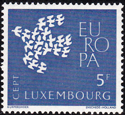 In Luxemburg erschienen die Europamarken 1961 am 18. September 1961. Hier die Marke zu 5 Fr blau mit dem Gemeinschaftsmotiv "Stilisierte Taube aus 19 Einzeltauben", die in einer Auflage von 2 140 000 Stück erschien.