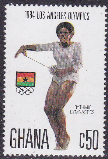 Auf der letzten Marke aus Ghana (MiNr 1052) wird ein Sportlerin bei der Rhythmischen Sportgymnastik gezeigt.