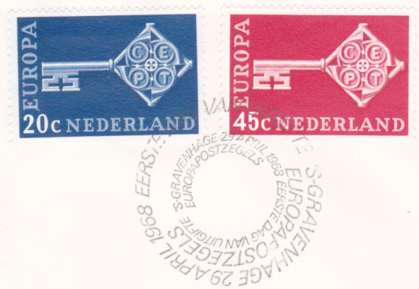 In den Niederlande erschienen die Europamarken 1968 am 29. April 1968 mit dem Gemeinschaftsmotiv "Kreuzbartschlüssel mit CEPT-Emblem". Hier die Marke zu 20 Cent preußischblau, die in einer Auflage von 31 322 000 Stück erschien.