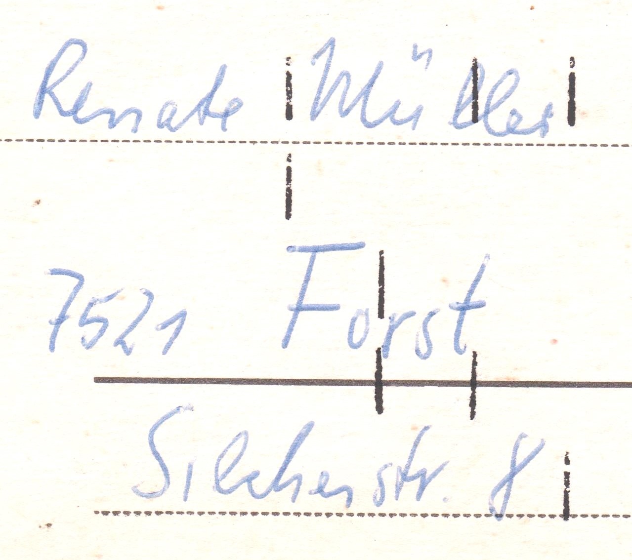 Diese Sendung wurde mit der Sortierinformation "1869" codiert, das entsprach der 1. Sortiermaschine, 8. Vorsortierrinne und dem Fach mit der Nummer 69. In diesem Fach wurde die gesamte abgehende Post aus dem Raum Pforzheim für die Postleitzahlen um die 4000 für Düsseldorf abgelegt.