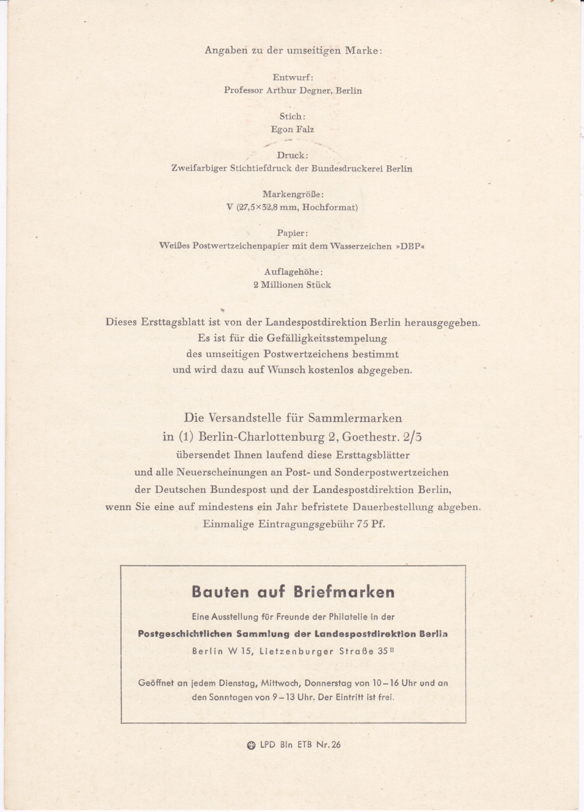 Hier zeige ich die Vorder- und Rückseite des ETB (MiNr ETB 26) mit der Marke zu 20+10 Pfennig (MiNr 168) mit Prof. Ludwig Heck. Dieses ETB wurde mit dem Sonderstempel aus Berlin zum Oktoberfest im Zoo am Ausgabetag der Marke gestempelt.