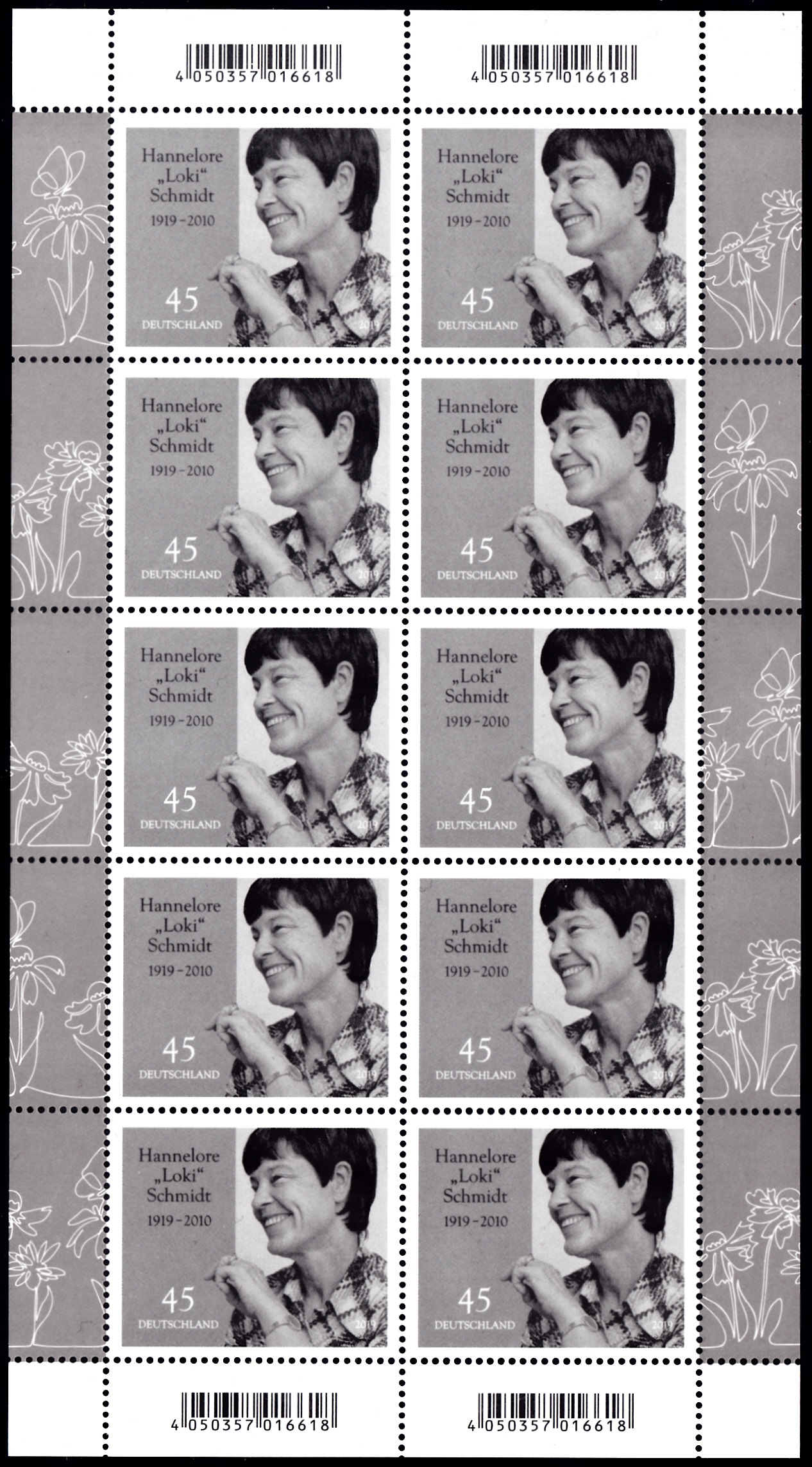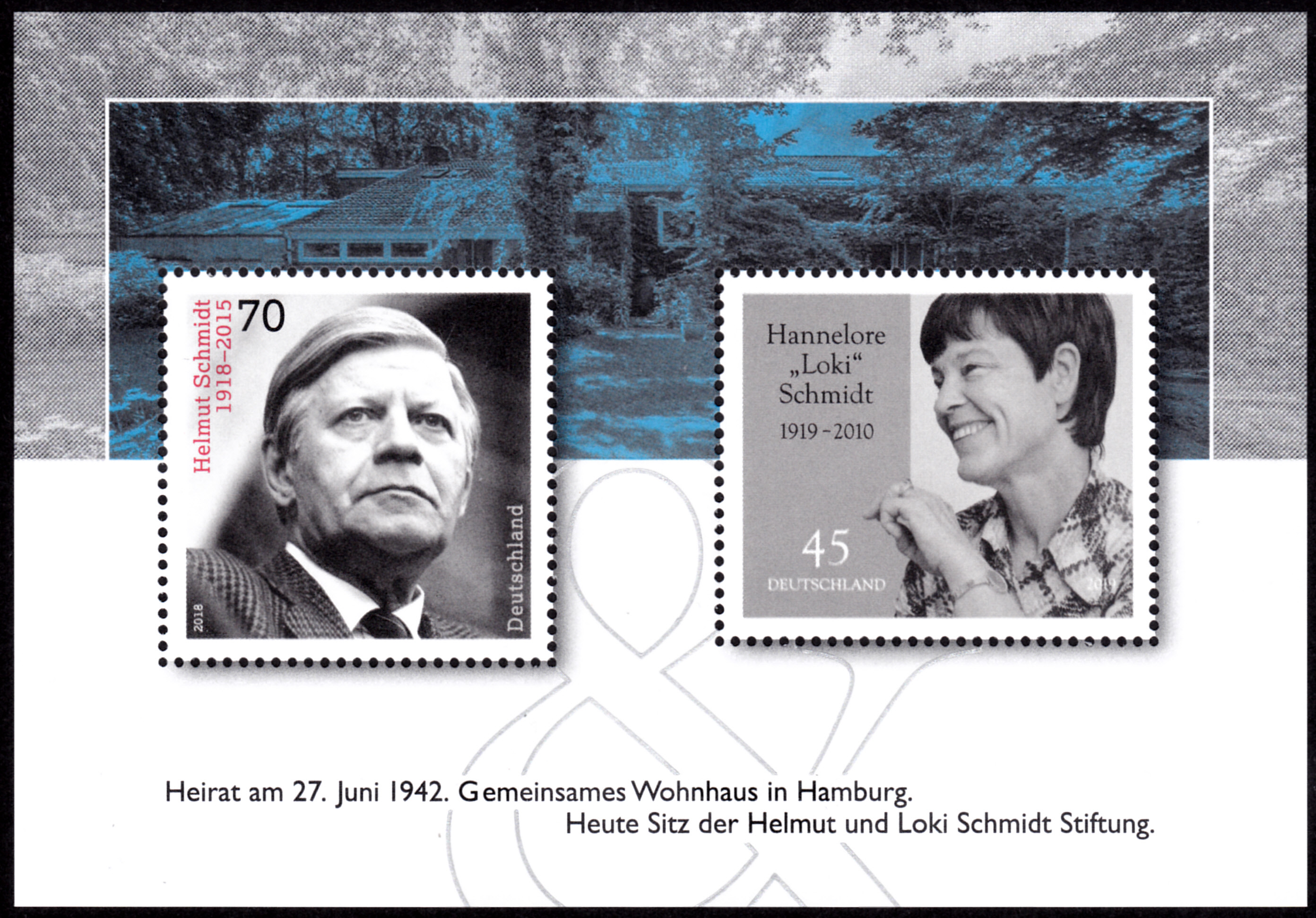 Die Marken zum 100. Geburtstag von Helmut Schmidt (MiNr 3429) und Hannelore "Loki" Schmidt (MiNr 3448) sind auchn zusammen in Block (MiNr Block 83) erschienen. Dieser Block wurde nicht über die Postfilialen verkauft.