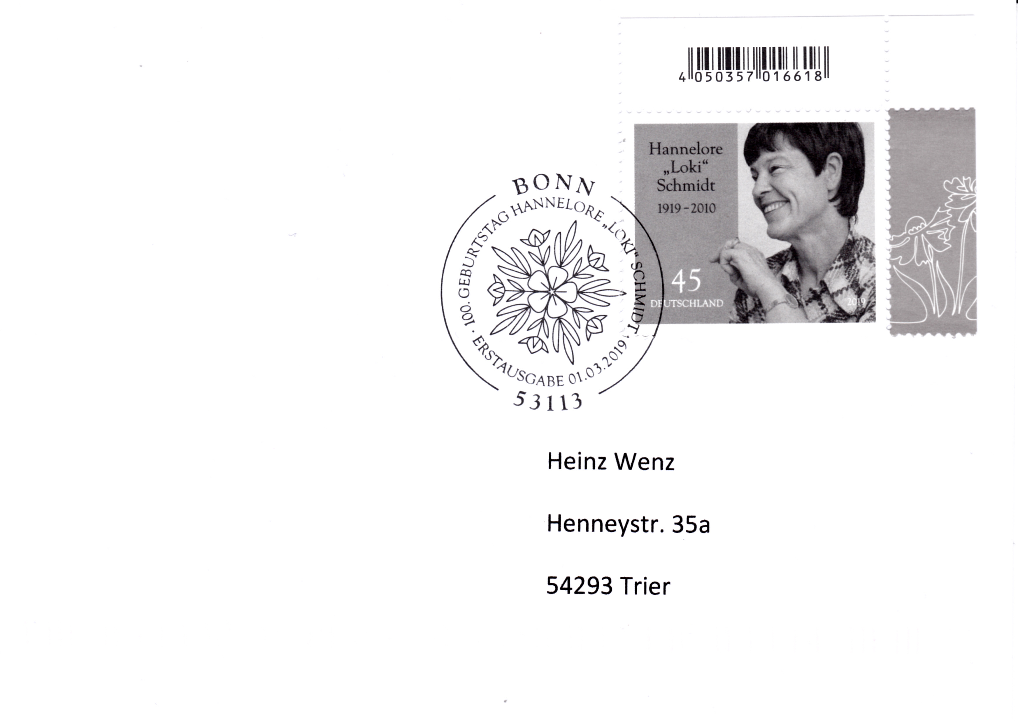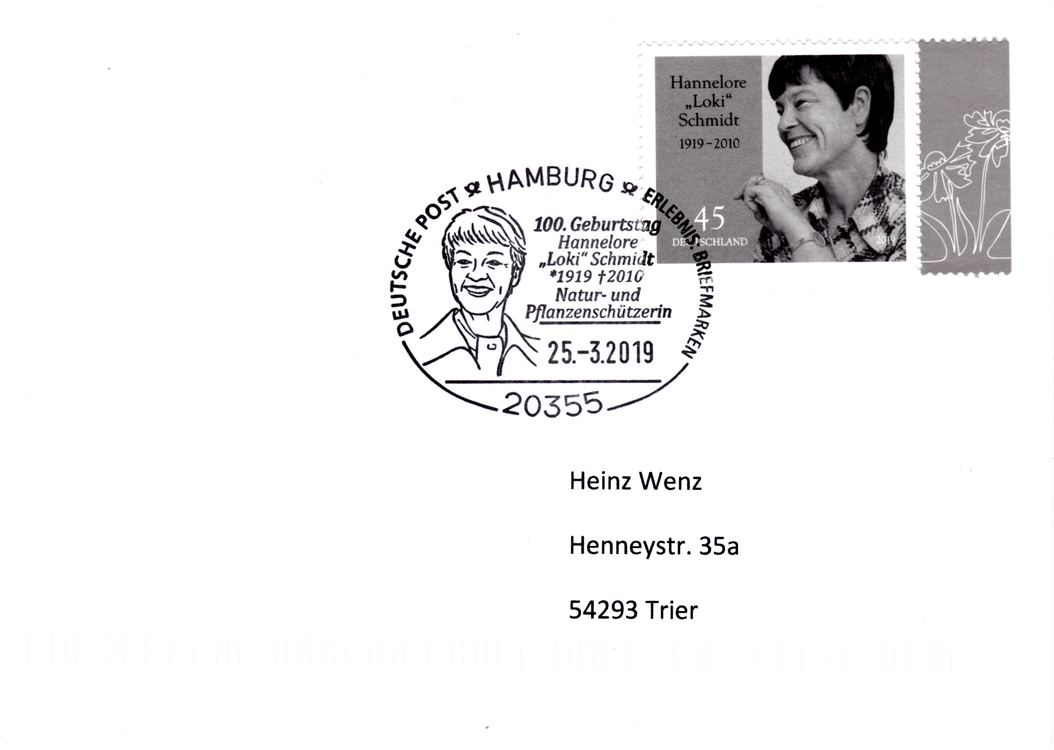 Inn Hamburg wurde am 25.3.2019 auch ein Sonderstempel passend zur Markem und dem 100. Geburtstag von Loki Schmidt eingesetzt. Dieser zeigt ihr Porträt.