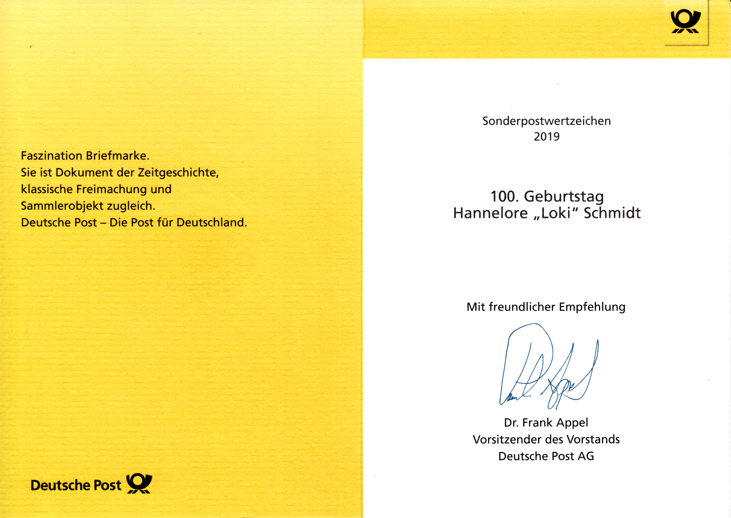 Klappkarte des Vorstandsvorsitzenden der Deutschen Post AG mit der Marke "100. Geburtstag von Hannelore „Loki“ Schmidt" (MiNr 3448) und mit dem Ersttagsonderstempel Bonn.