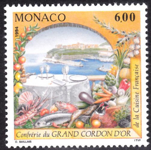 Zum Jubiläum "25 Jahre kulinarische Bruderschaft des Großen Goldenen Bandes der französischen Küche" gab es in Monaco eine Marke (MiNr 2177) , die einen gedeckten Tisch mit Blick auf den Felsen von Monaco und verschiedene Delikatessen zeigt.