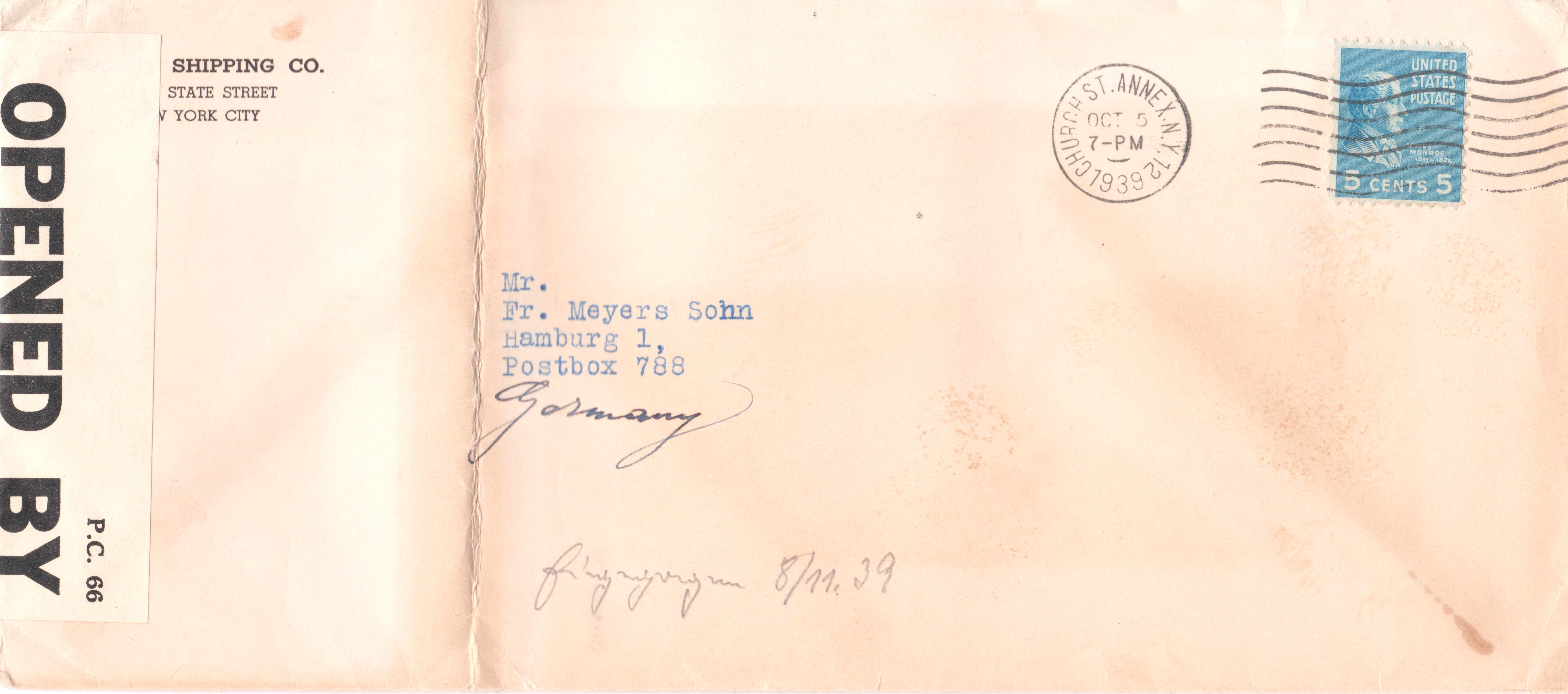 Dieser an eine Postfachadresse in Hamburg adressierte Brief wurde am 05.10.1939 in New York aufgegeben: