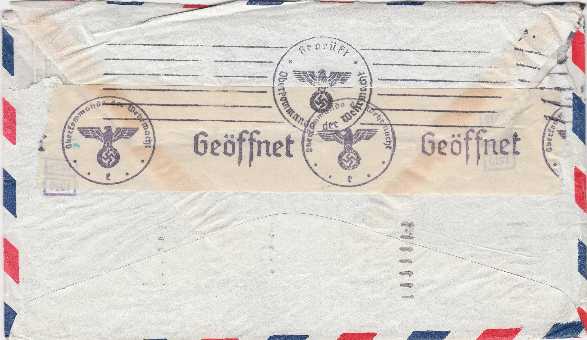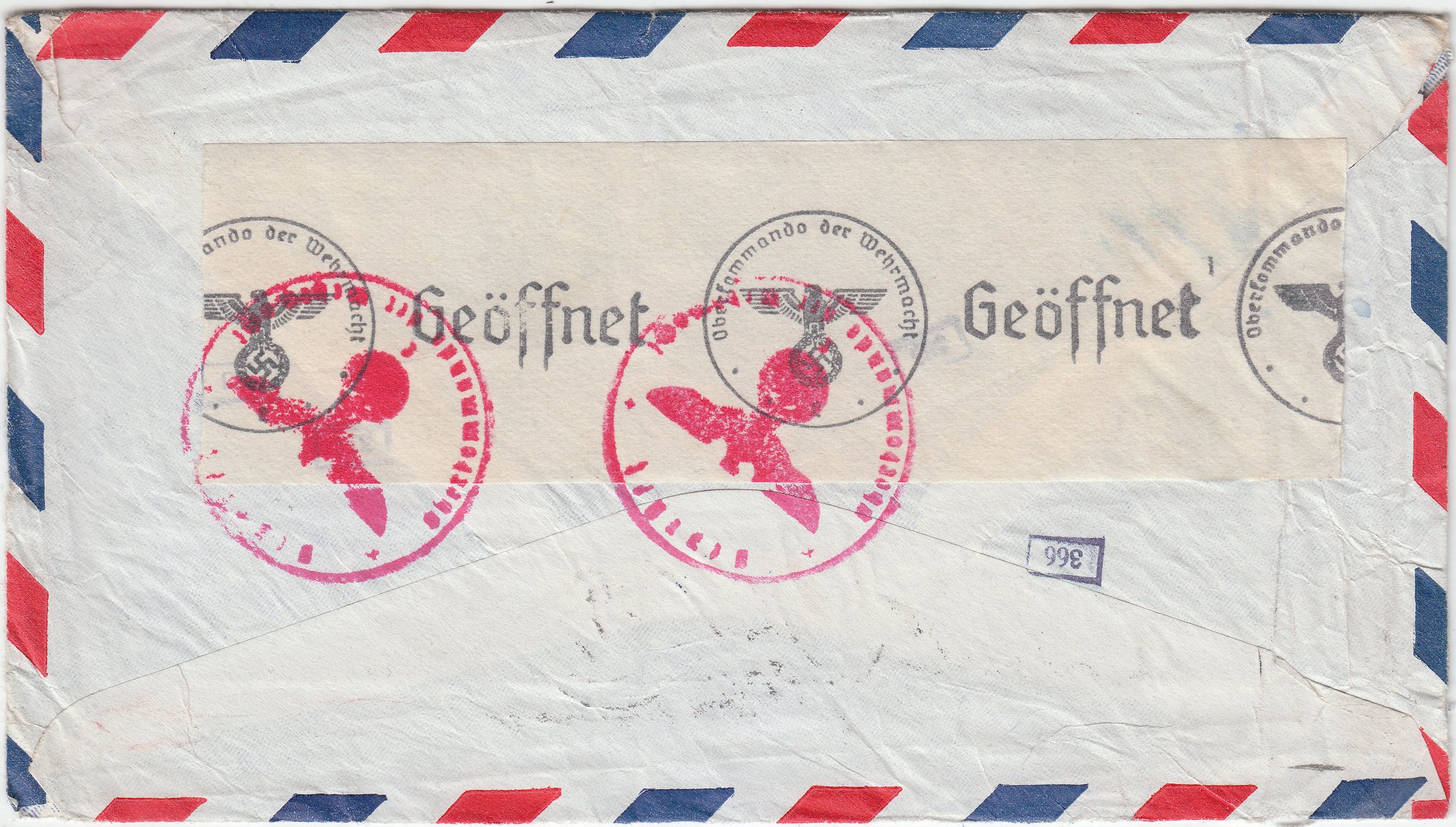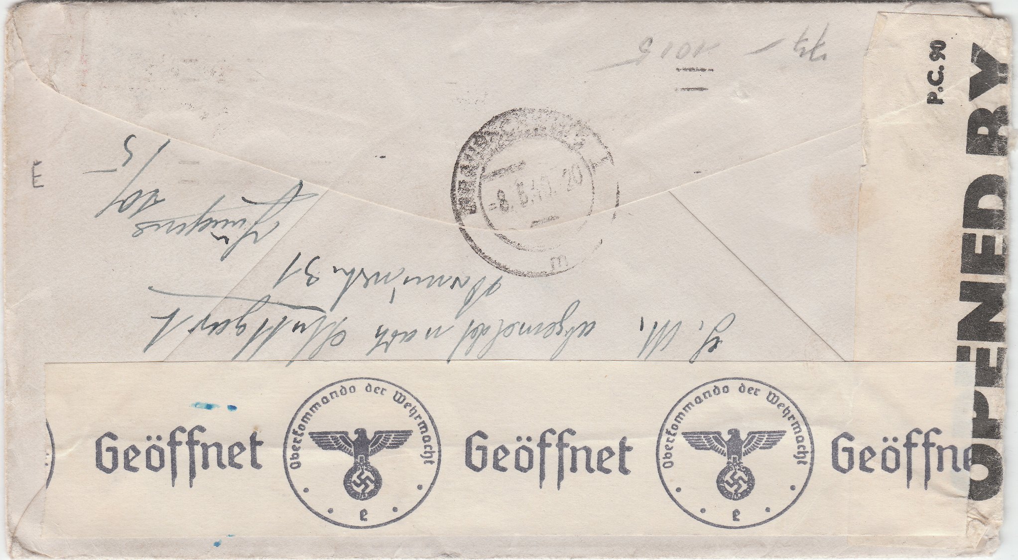 Dort wurde der Brief rückseitig geöffnet und nach erfolgter Zensurierung mit einem Endlosstreifen mit abwechselndem Eindruck von "Geöffnet" sowie einem Kreis mit "Oberkommando der Wehrmacht e" wieder verschlossen. Landsmann katalogisiert diesen Verschlußstreifen als EV3.3.