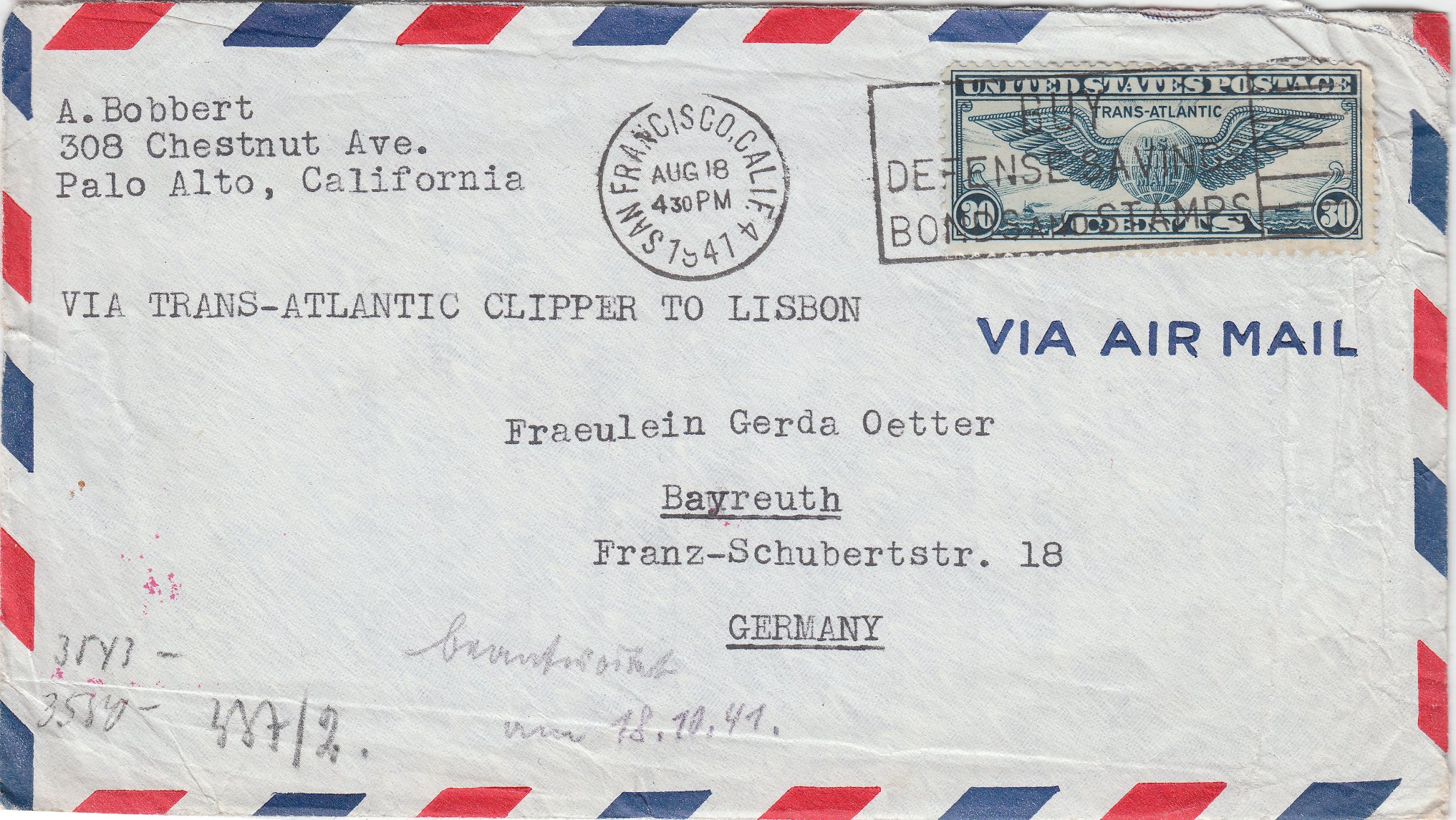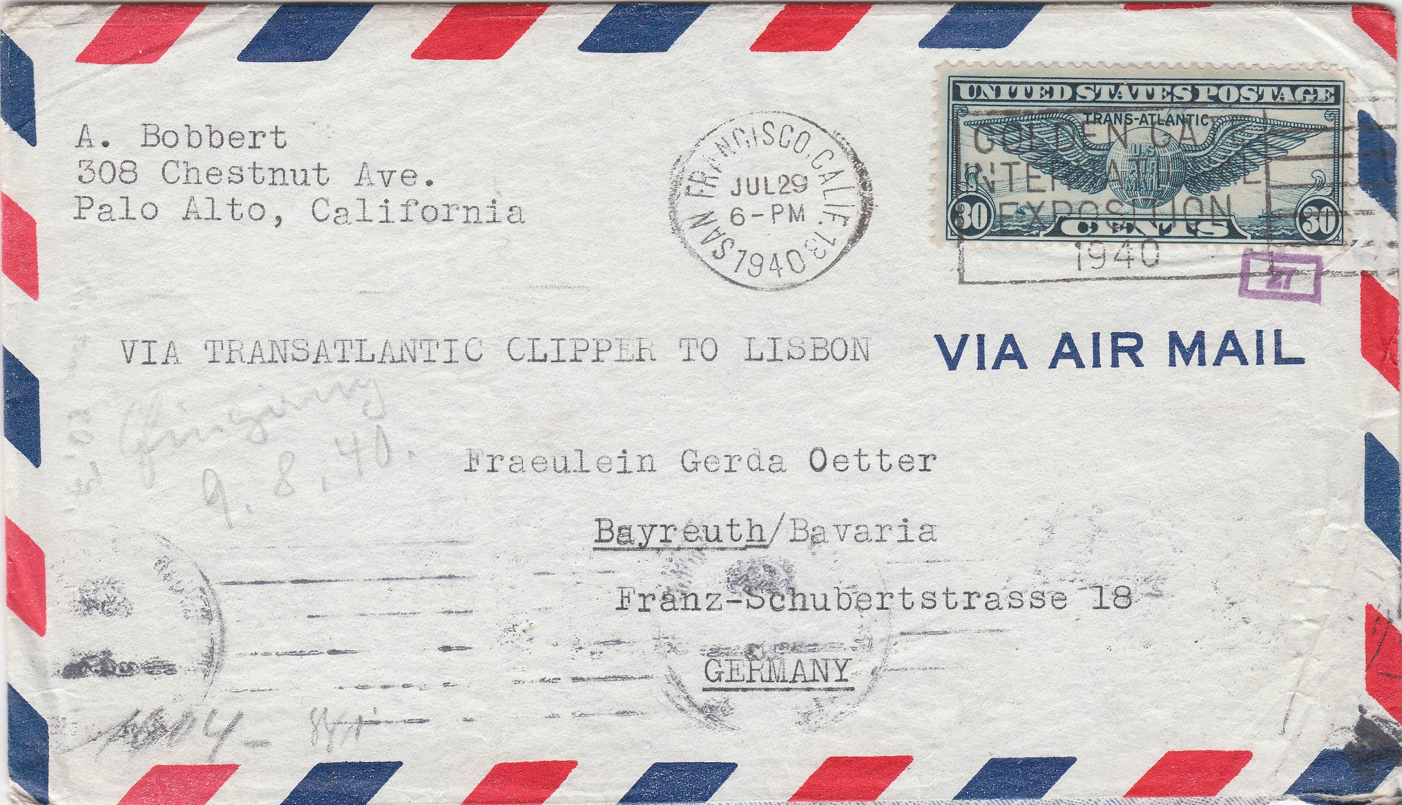 Dieser nach Bayreuth adressierte Luftpostbrief aus den USA ab SAN FRANCISCO vom 29.07.1940 lief laut Vermerk des Absenders "VIA TRANSATLANTIC CLIPPER TO LISBON", wurde also mit einem Flugboot BOEING 314 über den Atlantik nach Lissabon befördert: