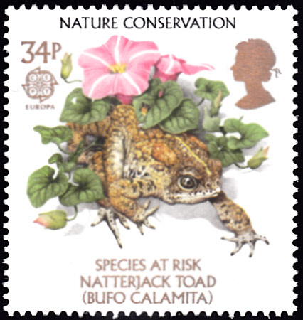 In Großbritannien erschienen die Europamarken 1986 am 20. Mai 1986 zum Gemeinschaftsthema "Natur- und Umweltschutz". Hier die Marke zu 34 Pence mit einer Kreuzkröte (Bufo calamita). Die Auflage dieser Marke betrug 6 022 000 Stück.