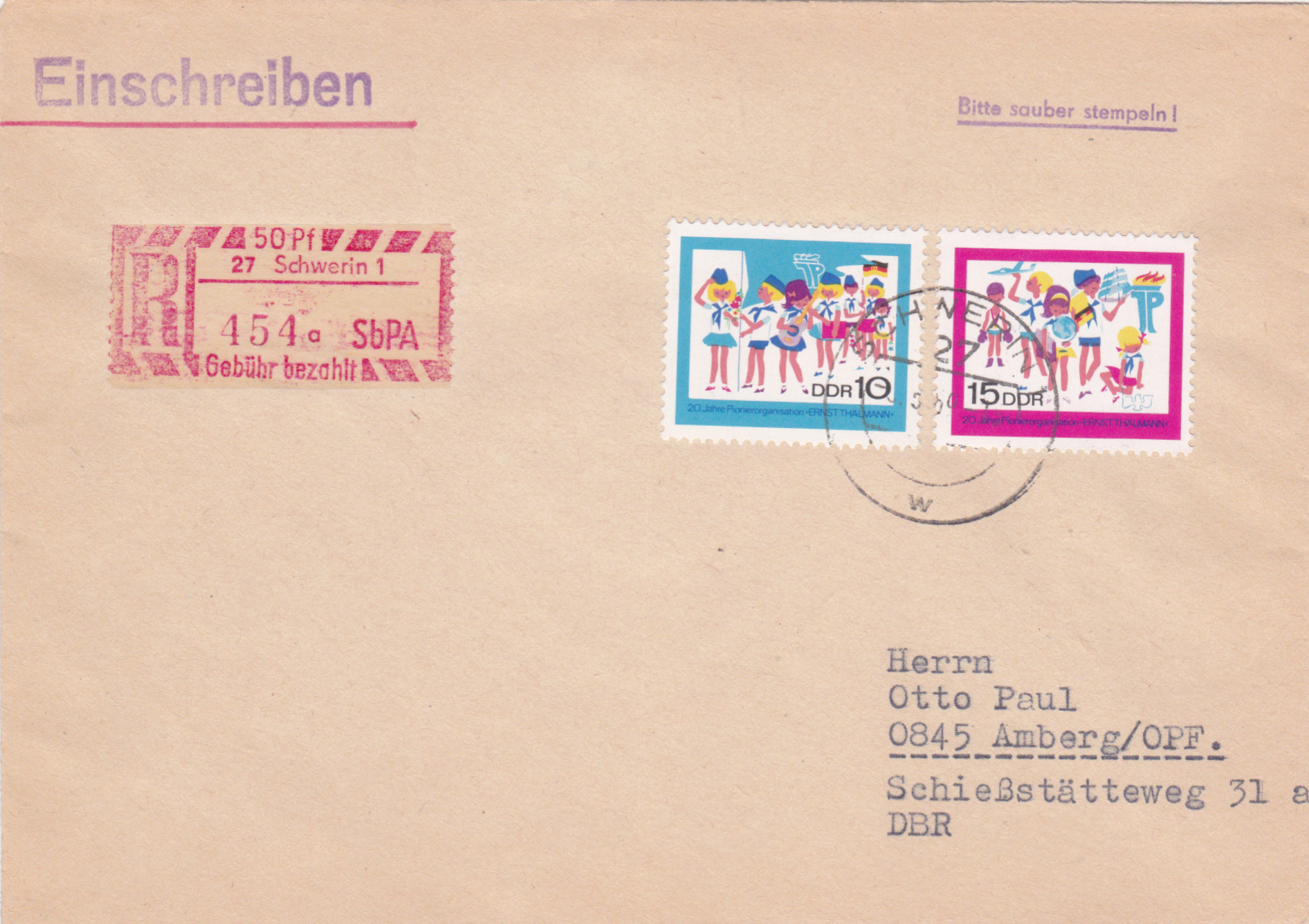 Brief von Schwerin nach Amberg in der Oberpfalz mit einem Einschreibe-Gebührenzettel des SbPA 27 Schwerin 1 und den beiden Marken zum Jubiläum "20 Jahre Pionierorganisation Ernst Thälmann" (MiNr 1432/1433). Der Brief ist 5 Pfennig überfrankiert.