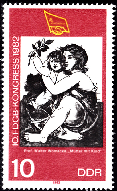 Auf einer weiteren Marke der DDR (MiNr 2699) wird die Lithographie "Mutter mit Kind" von Walter Womacka gezeigt.