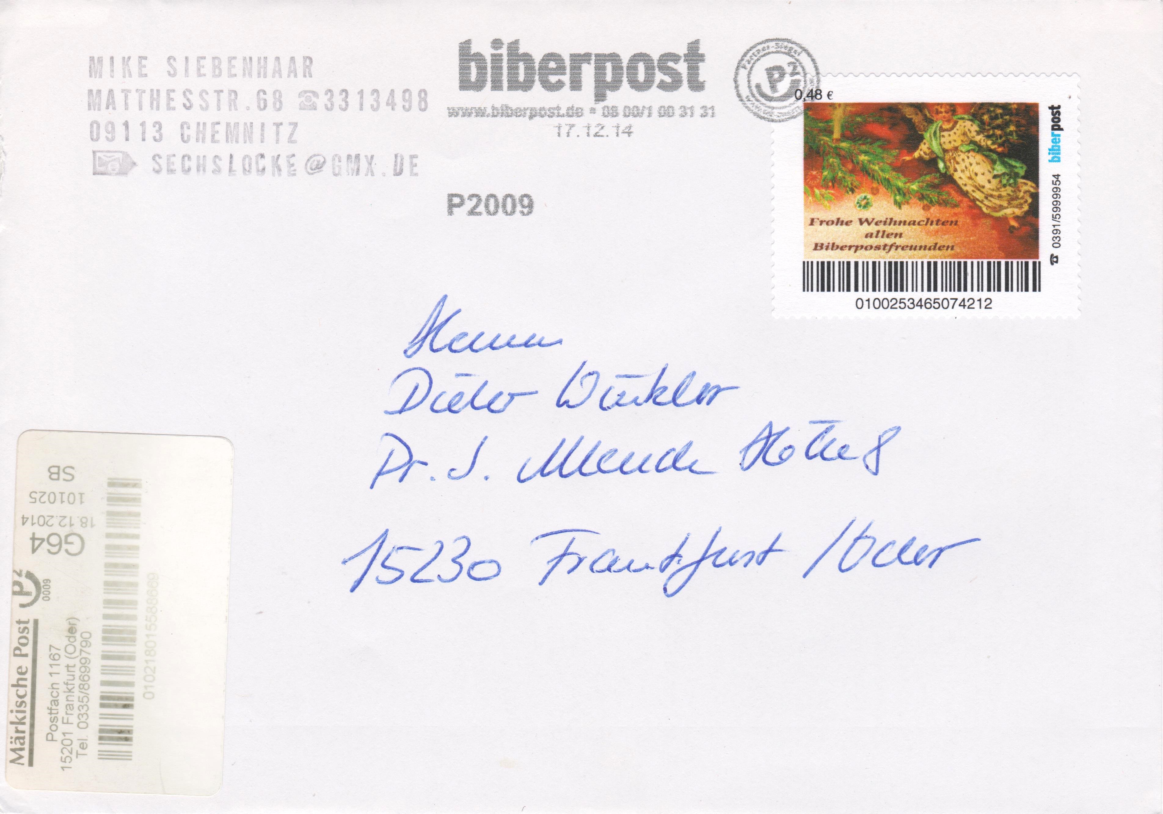 Dieser am 17.12.2014 in Magdeburg bei biber post aufgegebene Brief nach 15230 Frankfurt/Oder wurde am 18.12.2014 zur Zustellung übergeben an die Märkische Post in Frankfurt (Oder), was ein vorderseitig angebrachter Aufkleber dokumentiert: