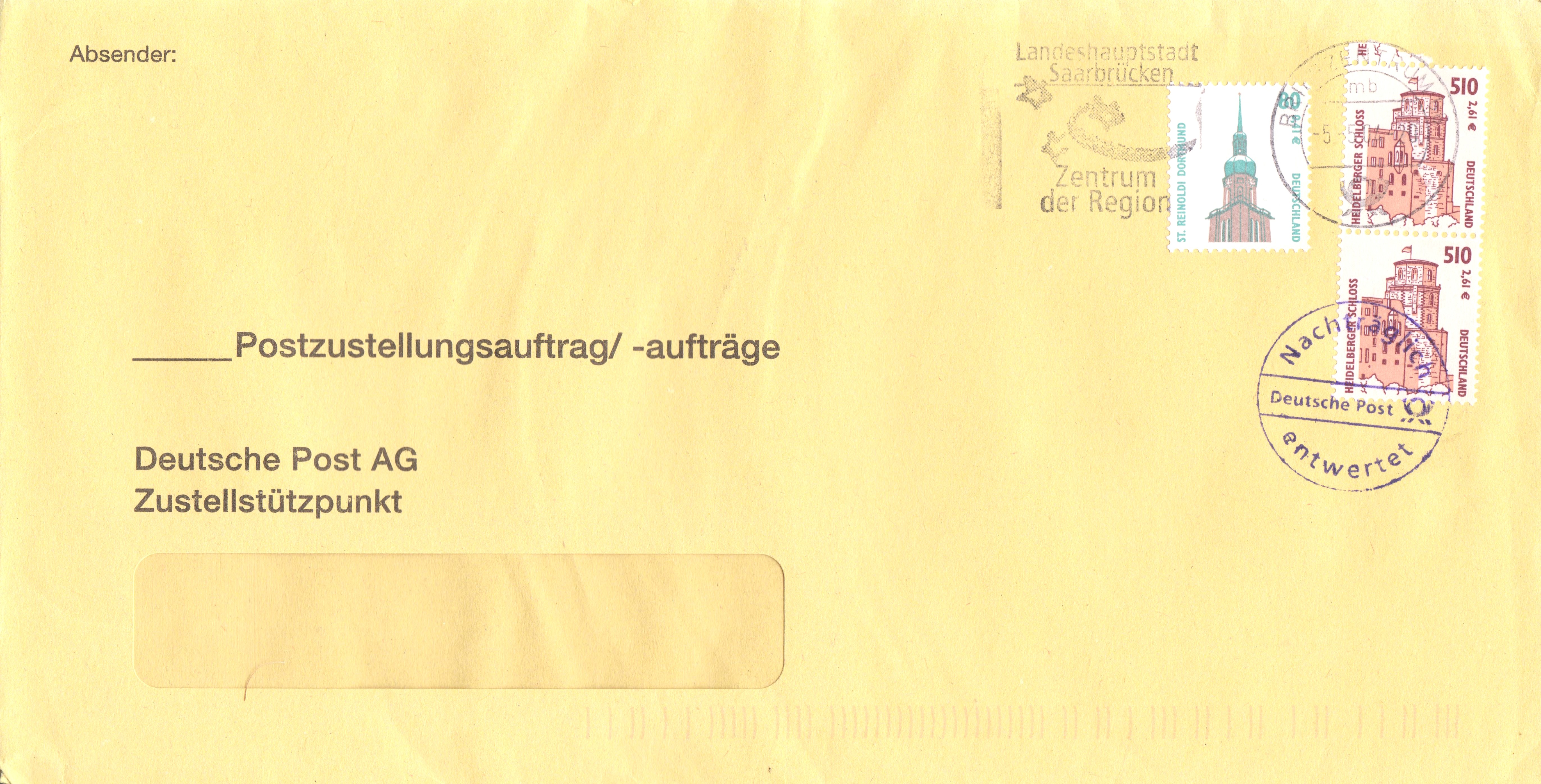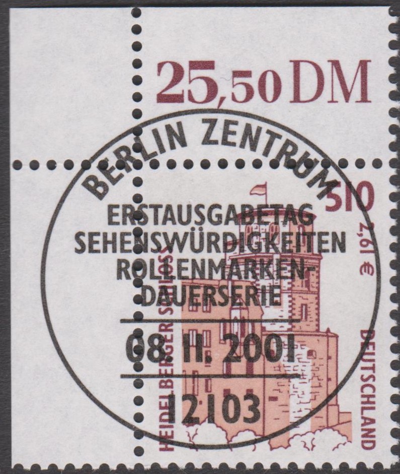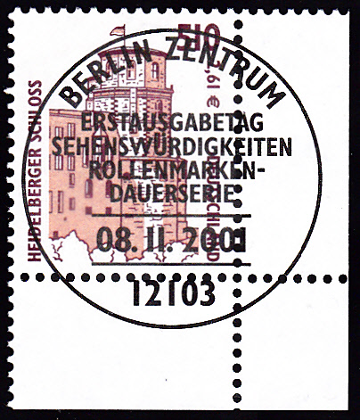 Am 8.11.2001 wurde die Marke zu 510Pf/2,61 € verausgabt, sie zeigt als Motiv das Heidelberger Schloss. Hier eine Marke vom linken unteren Bogenrand: