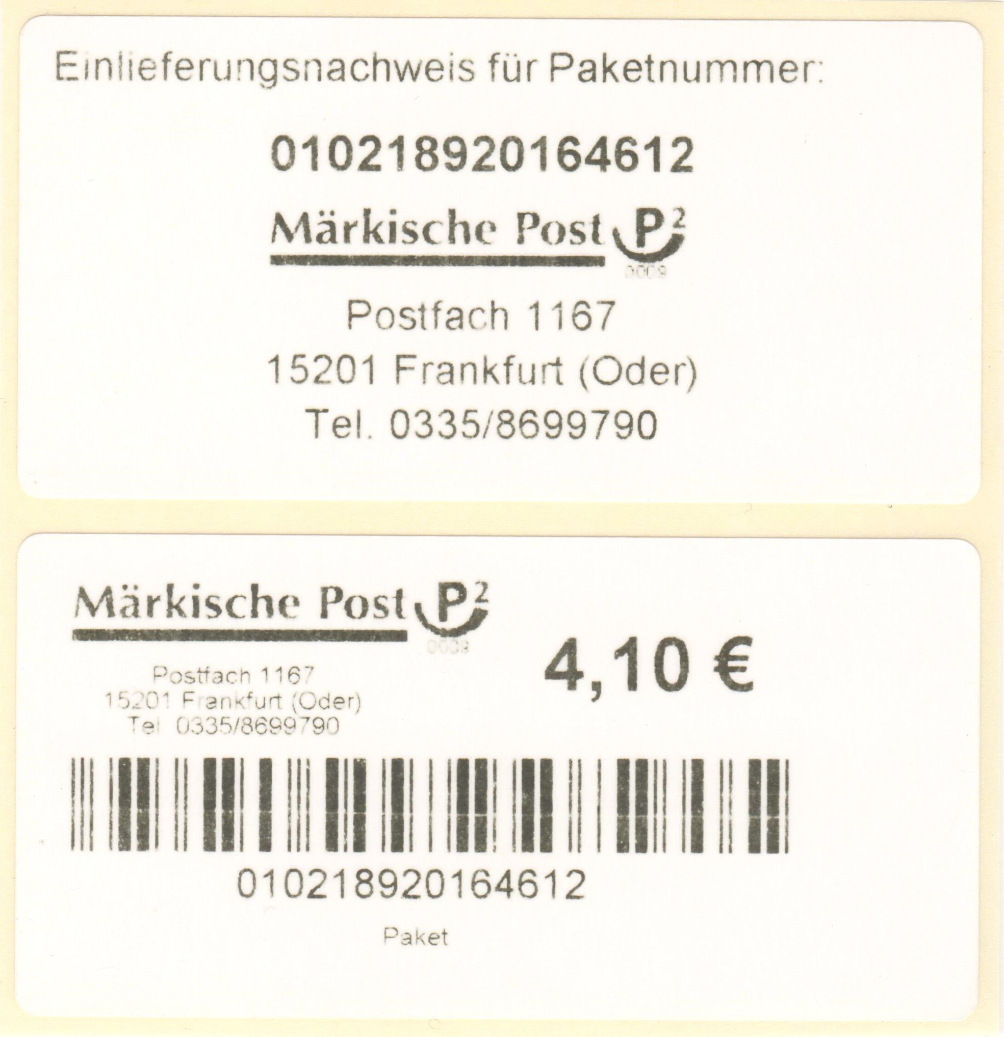Paket-Label sowie "Einlieferungsnachweis für Paketnummer", Wertstufe 4,10 € bzw. 5,90 €: