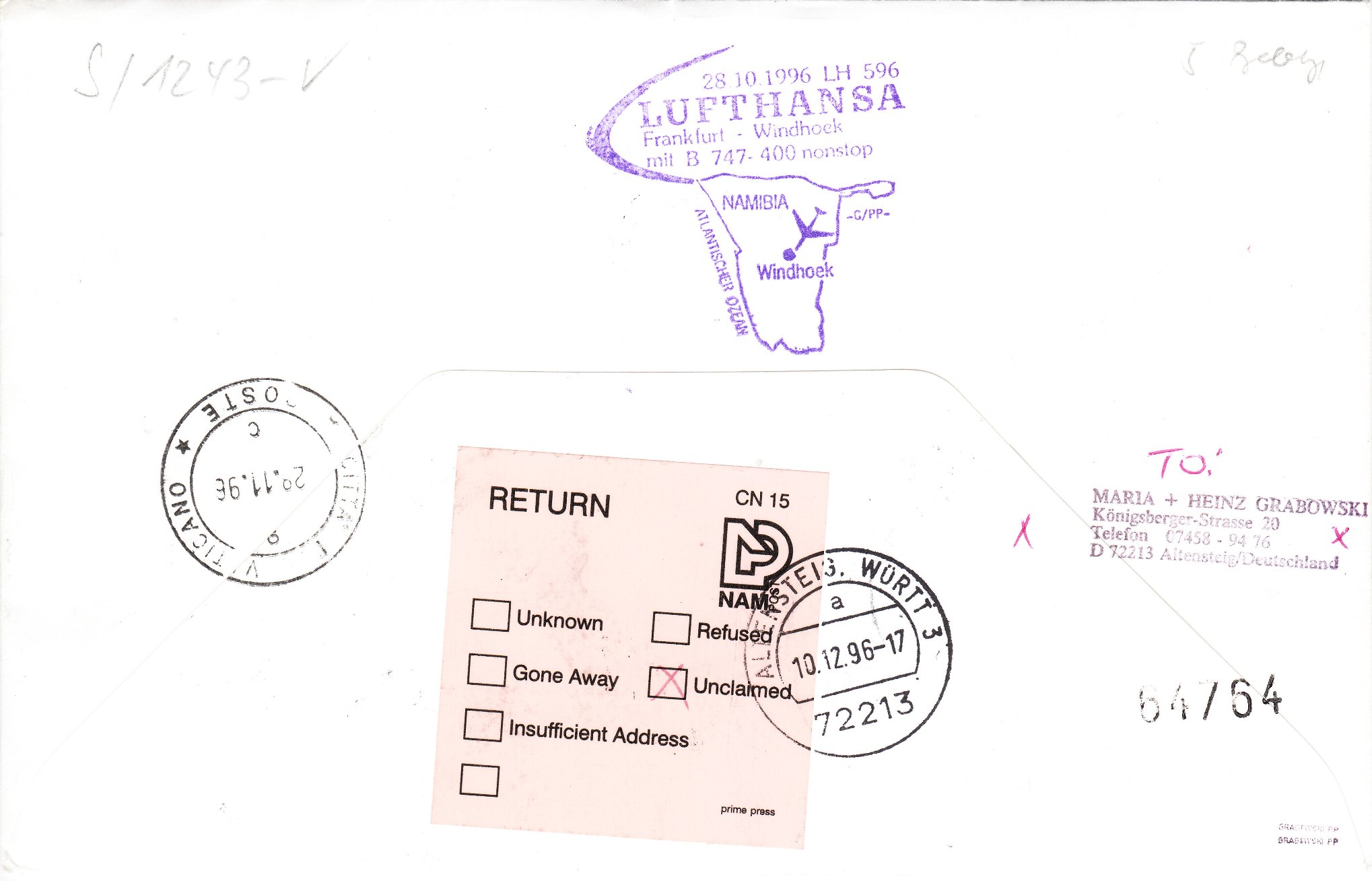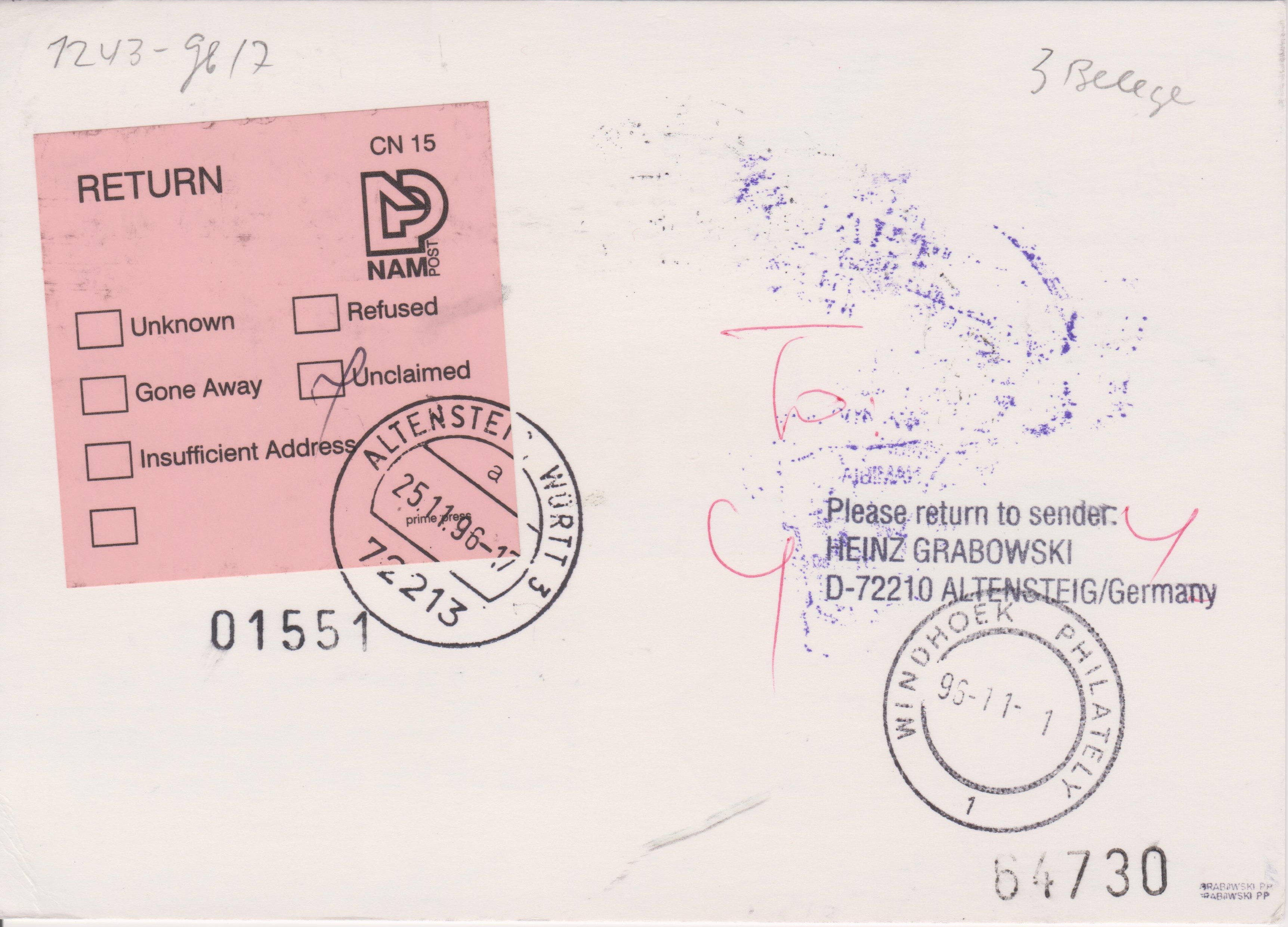 Im Unterschied zu dem bereits gezeigten Beleg trägt dieser auf der Rückseite einen zusätzlichen Klebezettel der namibischen Post: