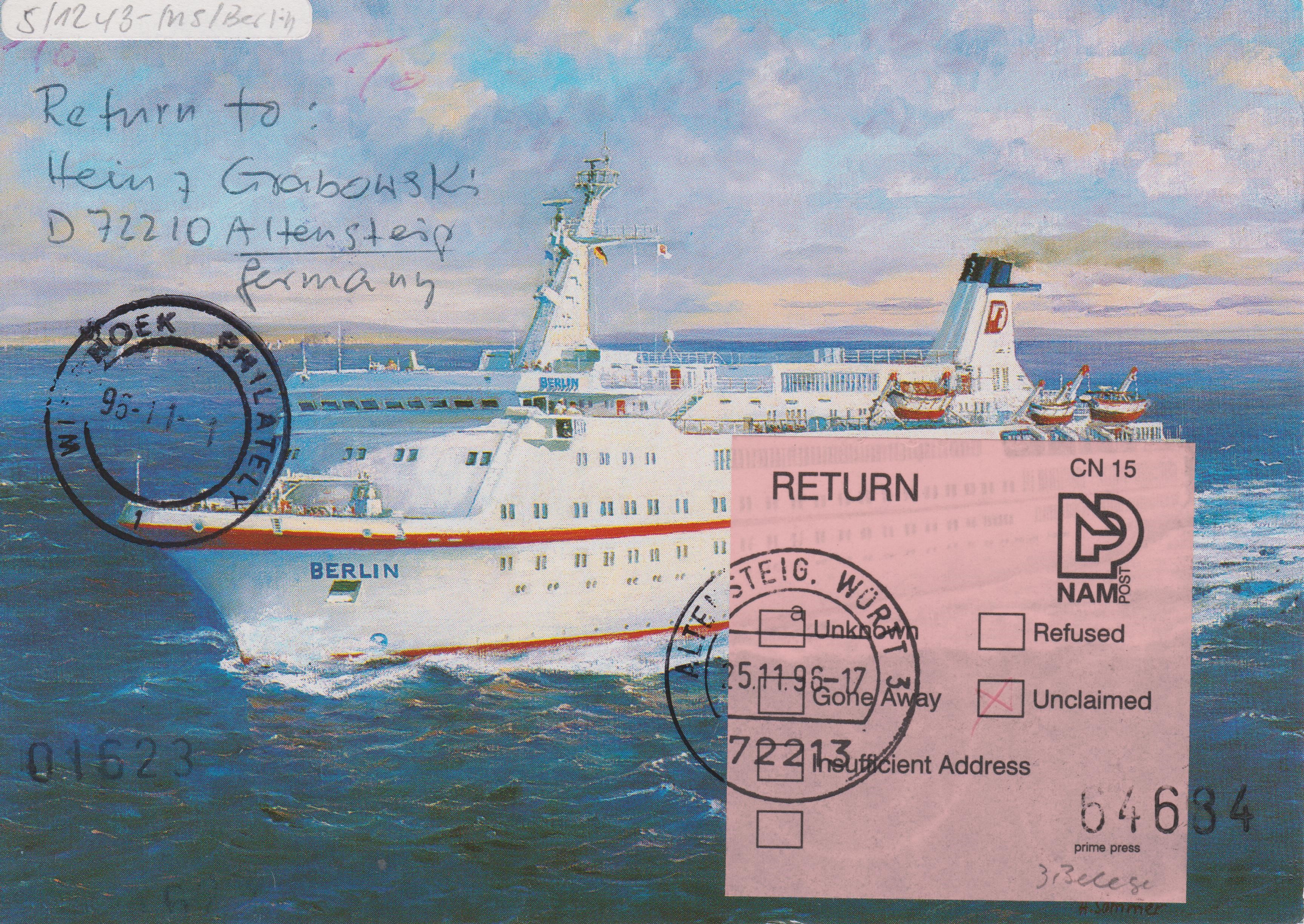 Dieser Beleg, eine Ansichtskarte des Schiffes MS BERLIN, wurde als Zuleitungspost an Bord des Kreuzfahrtschiffes MS BERLIN aufgegeben und trägt daher den Bordstempel des Schiffes und die deutsche Frankatur wurde mit dem Schiffspoststempel entwertet: