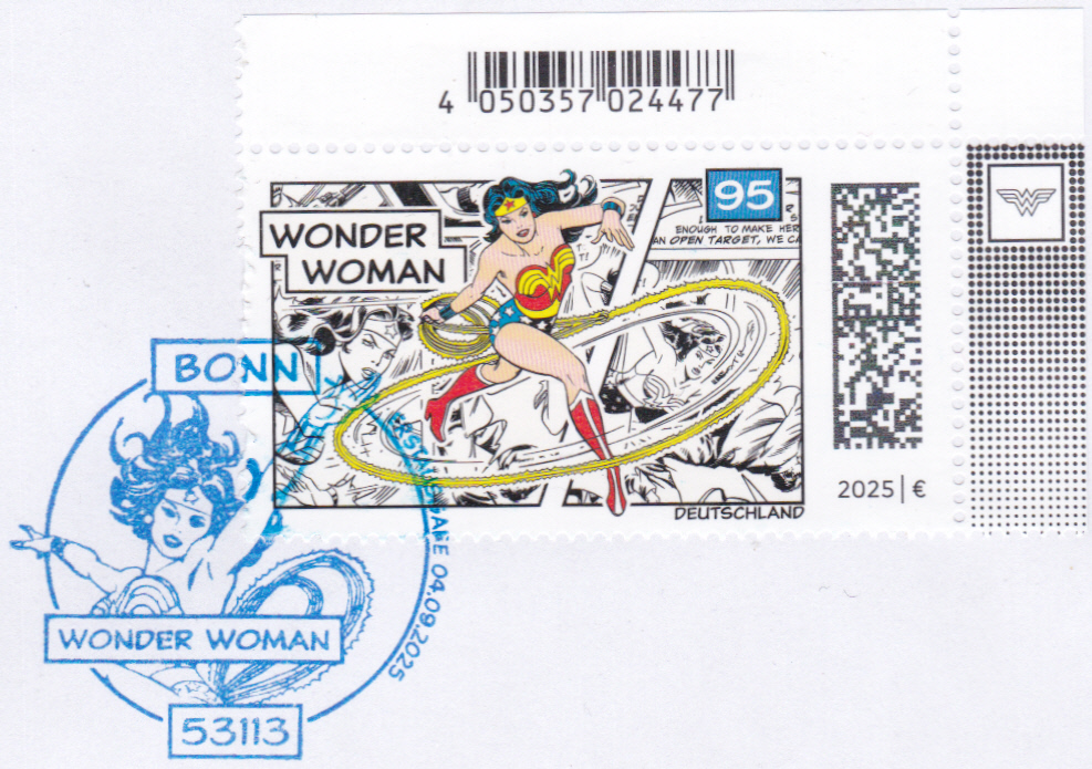 Bei der Deutschen Post ist eine Marke (MiNr 3925) mit der Abbildung Wonder Woman (Diana Prince, eigentlich Diana von Themyscira, Amazonenprinzessin) mit Lasso erschienen. Hier zeige ich eine Marke vom Eckrand mit EAN-Codierung.