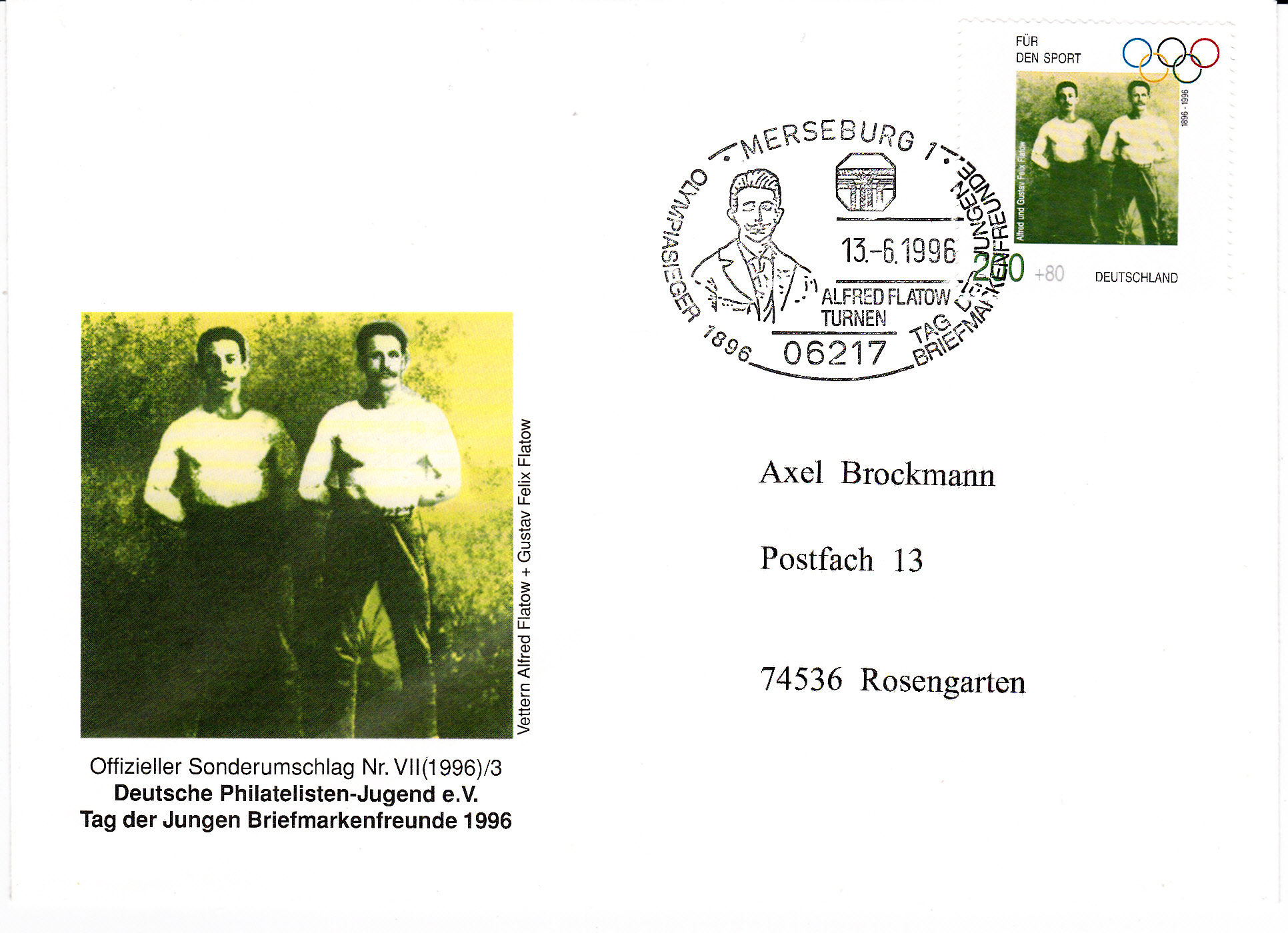 1996 erschien in der Zuschlagserie der Deutschen Bundespost zu den Olympischen Spiele 1996 mit Olympiasiegern ein Wert mit Alfred und Gustav Felix Flatow. Dieser Wert ist hier mit einem Sonderstempel zum Tag der Jungen Briefmarkenfreunde am Ausgabetag der Marke in Merseburg mit einem Sonderstempel mit Alfred Flatow im Stempelbild.
