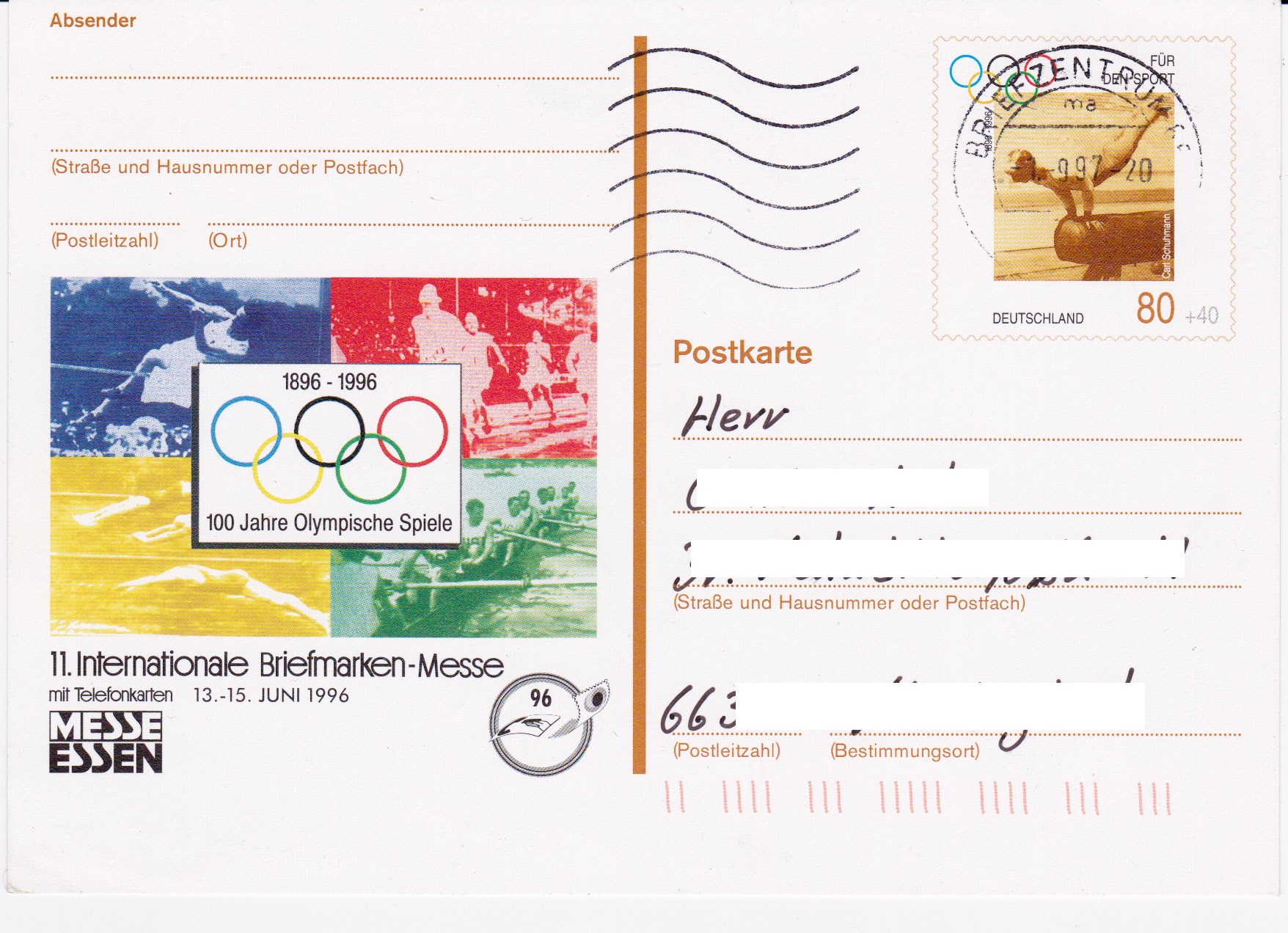 Die Sonderpostkarte zur 11. Intern. Briefmarkenmesse in Essen wurde mit einem Wertstempel der MiNr 1861 mit der Abbildung von Olympiasieger Carl Schuhmann verausgabt.