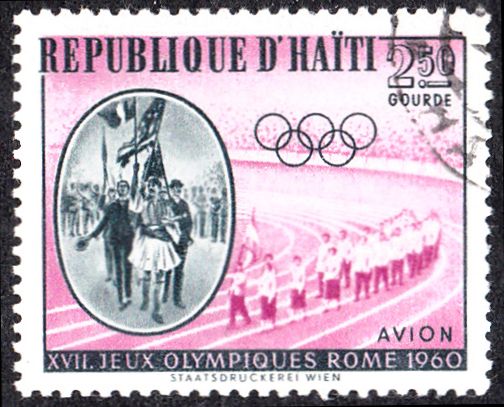 Diese von Heinz bereits in einem anderen Thread gezeigte Marke aus Haiti zeigt die Parade der Olympiasieger 1896 nach einer zeitgenössischen Zeichnung. Allen voran der Marathonläufer Spyridon Louis: