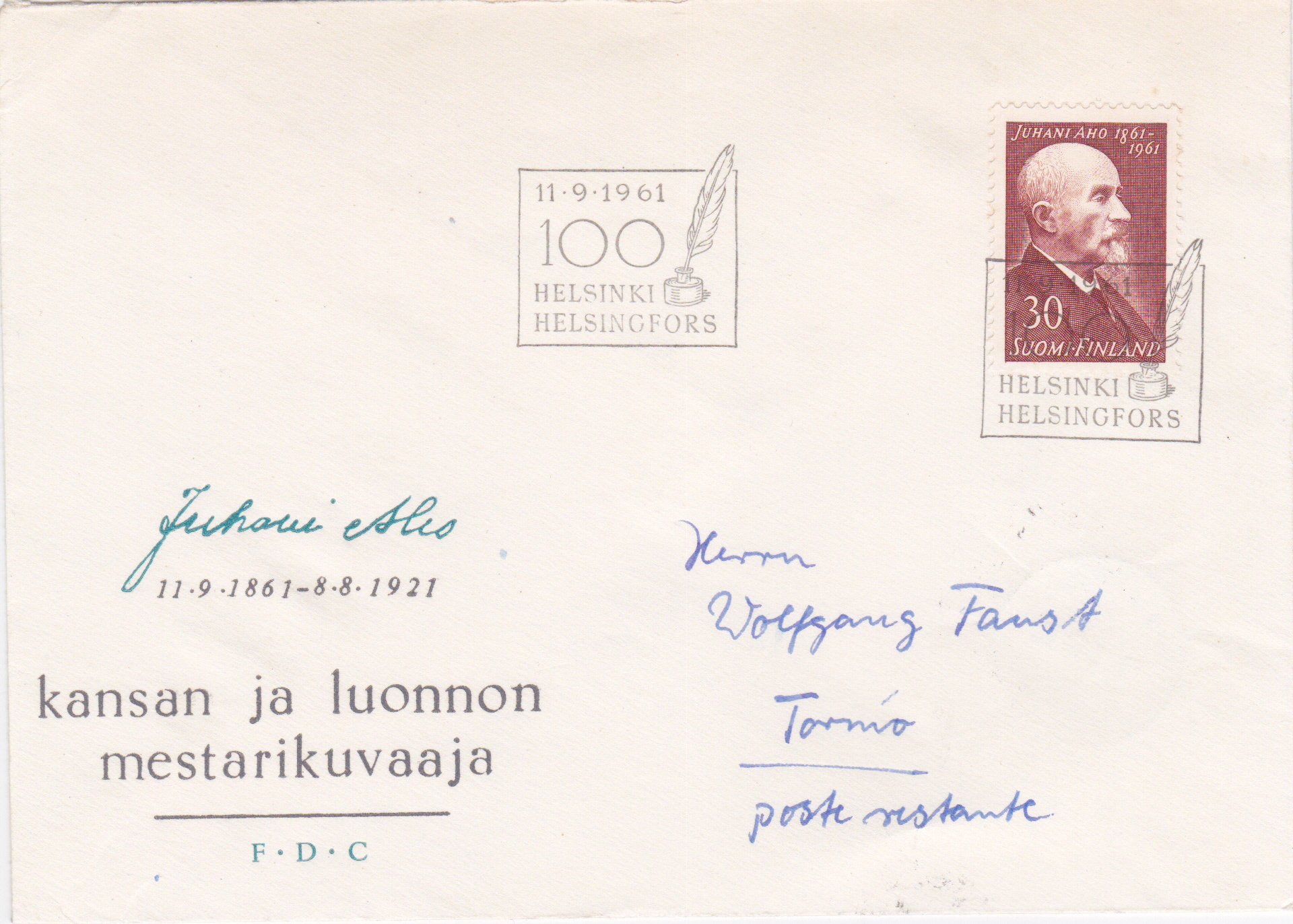 Gelaufener FDC mit dieser Marke und dem Ersttagsonderstempel aus Helsinki.