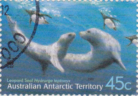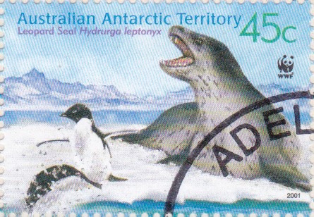 Aus den Australischen Gebiete in der Antarktis kommt diese Marke (MiNr 145) mit einem Seeleopard-Weibchen mit Jungem