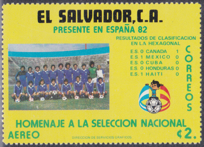 Es gibt noch eine vierte Marke (MiNr 1389), die wieder die Nationalmannschaft von El Salvador und ein Emblem zeigt. Es werden außerdem die Ergebnisse der Mannschaft von El Salvador bei der Qualifikation zur WM nennt.