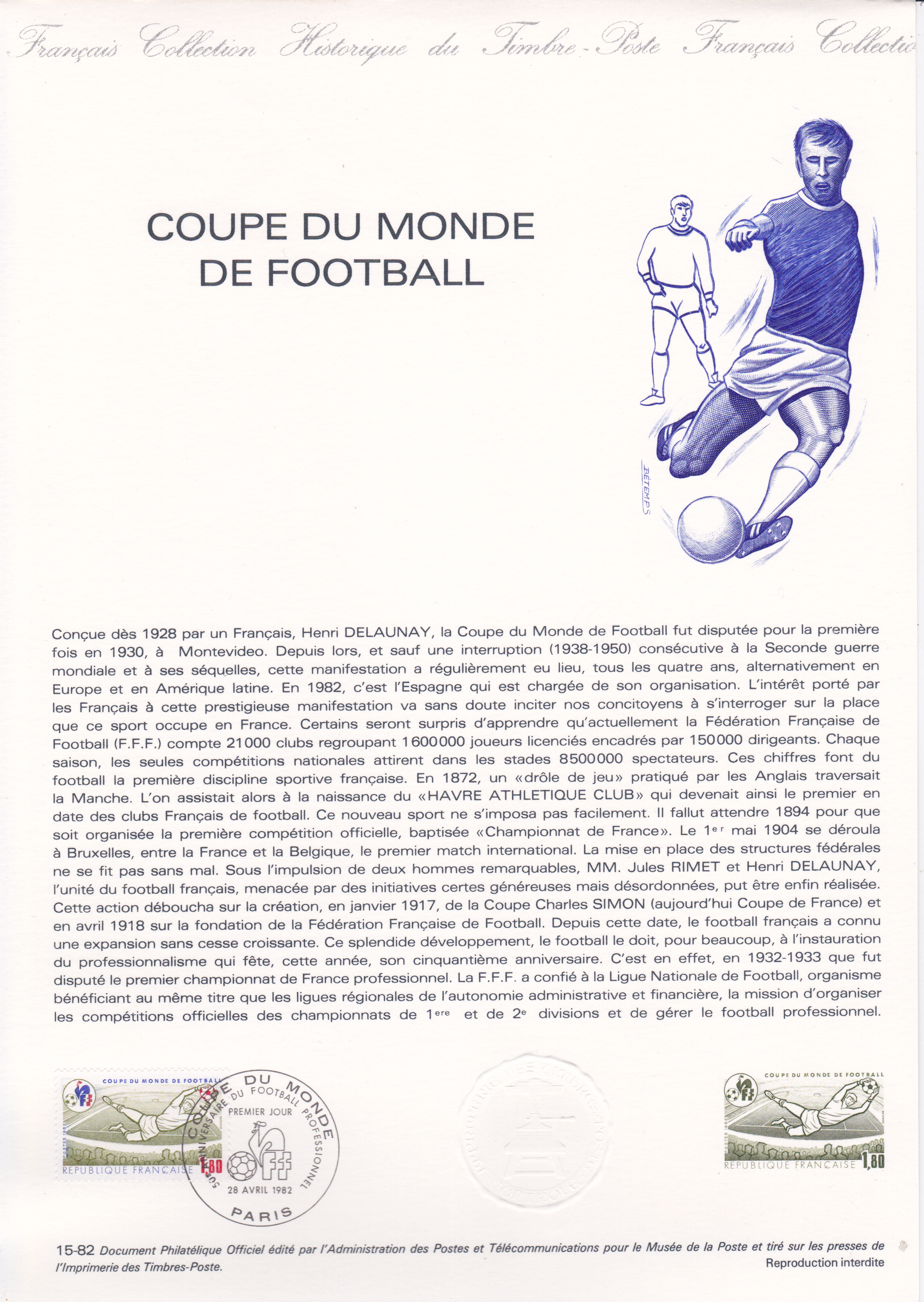 Ergänzend zu der bereits hier auf Seite 2 vorgestellten Marke (MiNr 2331) aus Frankreich zeige ich noch ein "Philatelistisches Dokument" (Document Philatelie Officiel), das von der Briefmarkendruckerei in Boulazac (nähe Perigeux) für die französische Post hergestellt und verkauft wurde. Es enthält die zur WM 1982 in Frankreich erschienene Marke, die mit dem Ersttagsonderstempel Paris gestempelt wurde. Rechts unten ist auch ein einfarbiges Markenbild eingedruckt.