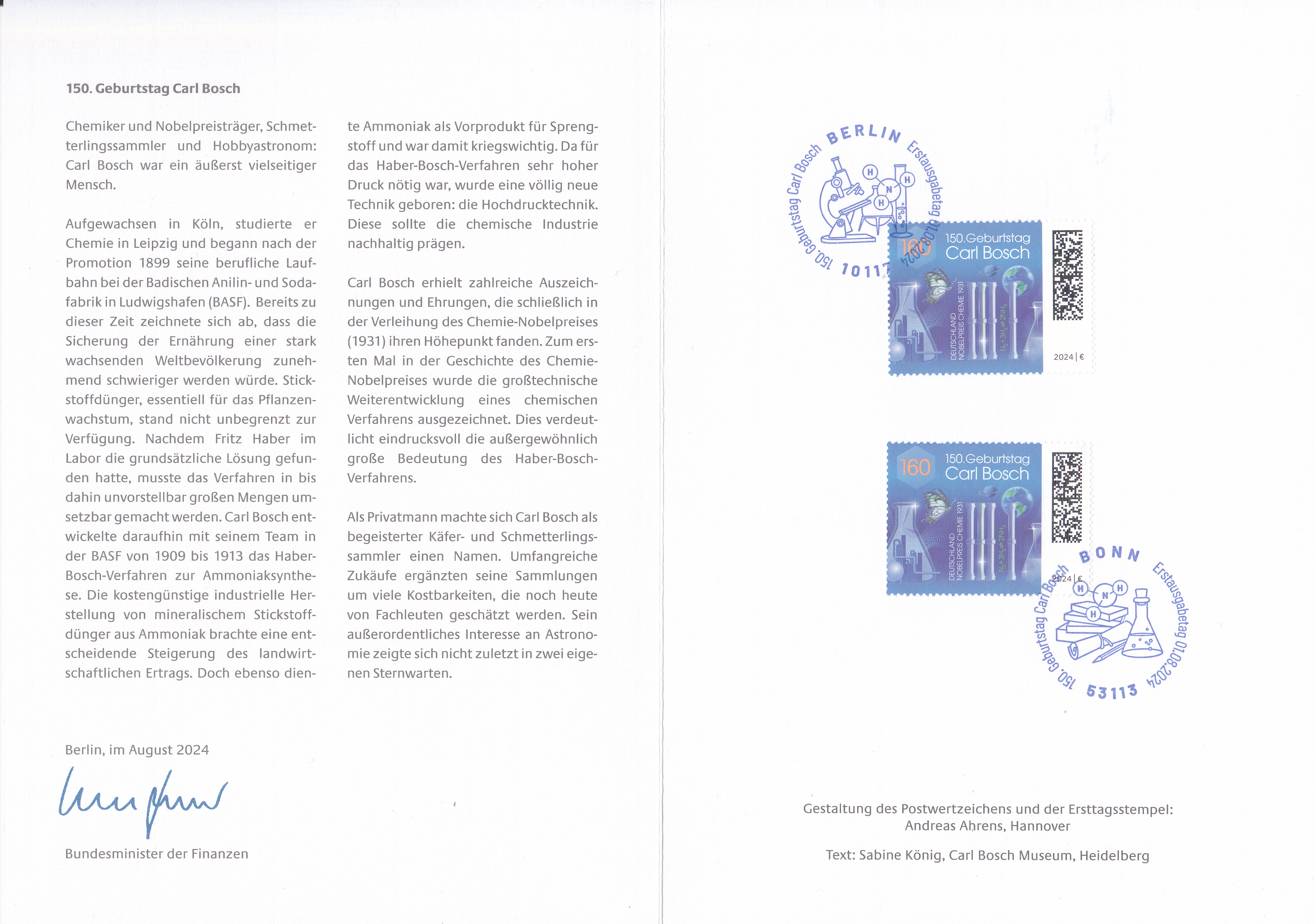 Ministerkarte des Bundesministers für Finanzen mit zwei Marken zum 150. Geburtstag von Carl Bosch (MiNr 3848) mit und den beiden Ersttagsonderstempel Bonn und Berlin.