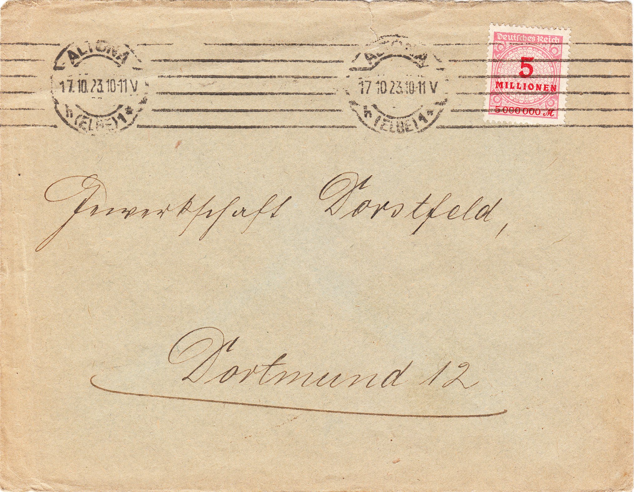 Ein Fernbrief bis 20g kostete vom 10.10.1923 bis zum 19.10.1923 ein Porto von 5 Millionen Mark, hier ein Exemplar vom 17.10.1923 gelaufen von Altona nach Dortmund: