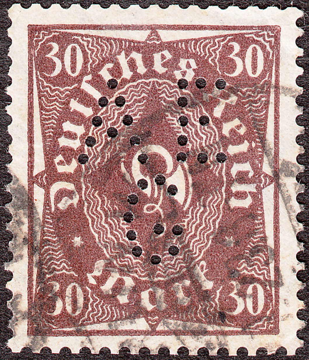 Die Marke in der Farbe "b" zeigt eine Firmenlochung "MAN" = Maschinenfabrik Augsburg-Nürnberg und wurde dementsprechend in NÜRNBERG gestempelt.