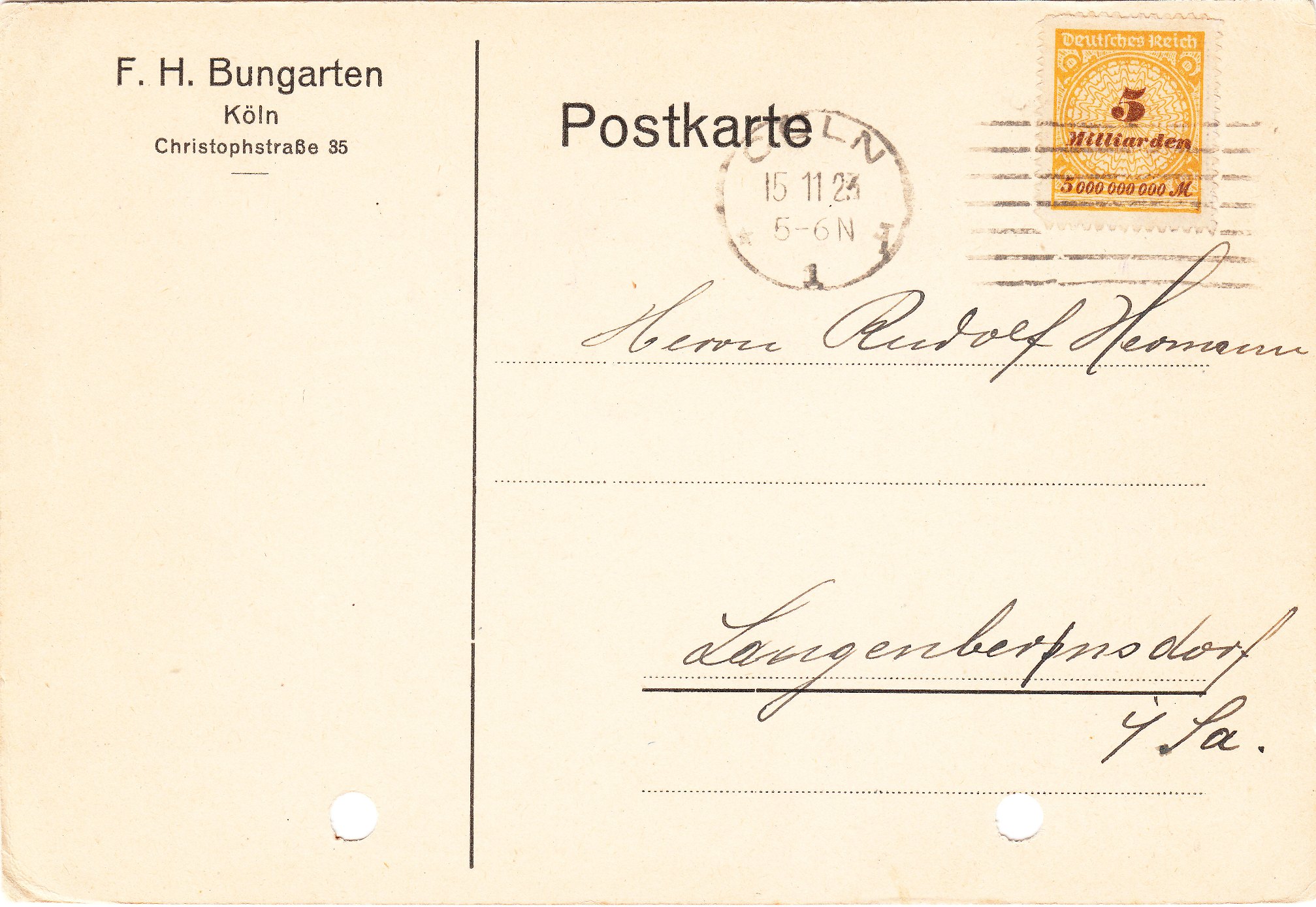 Während der kurzen Zeitspanne vom 12.11.1923 bis zum 19.11.1923, also ganze 8 Tage lang, galt für eine Postkarte im Fernverkehr die hier am 15.11.1923 als Einzelfrankatur mit einer MiNr. 327 B P dargestellte Portostufe von 5 Milliarden Mark: