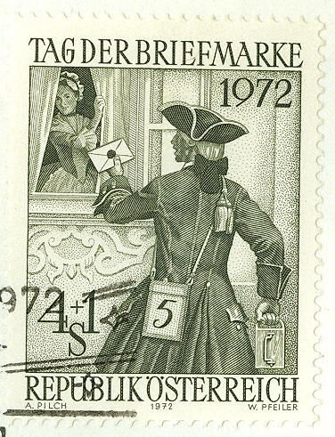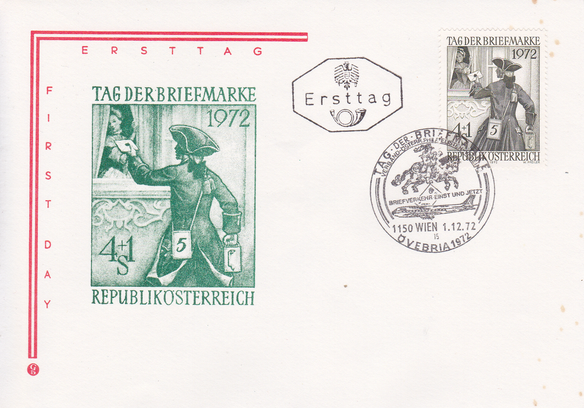 Brief per Eilboten von Wien nach Osnabrück frankiert mit drei Marken "Tag der Briefmarke 1972" und gestempelt mit dem Ersttagsonderstempel zum Tag der Briefmarke mit der Kennziffer "20". Rückseitig sind Ankunftsstempel "Düsseldorf Flughafen" und "Osnabrück" angebracht.