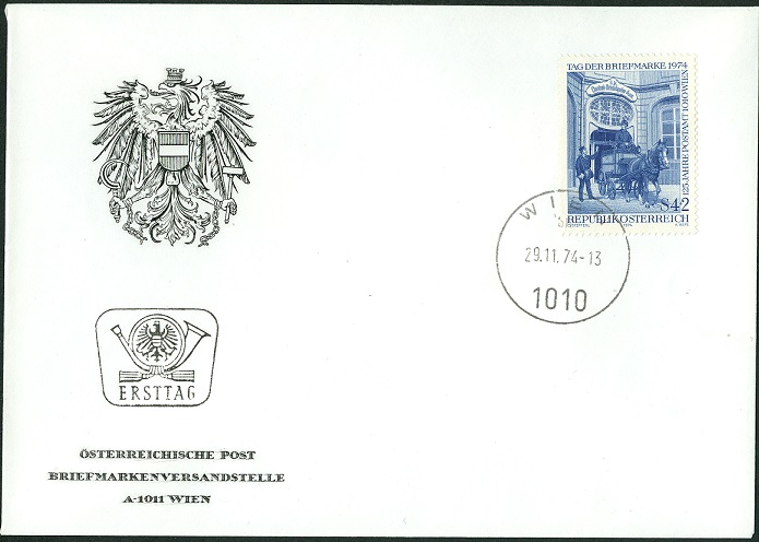 Am 29.11.1974 erschien in Österreich eine Zuschlagsmarke zum Tag der Briefmarke 1974 (MiNr 1471) mit dem Motiv "Posthof des Post- und Telegraphenamtes 1010 Wien im Jahre 1905".