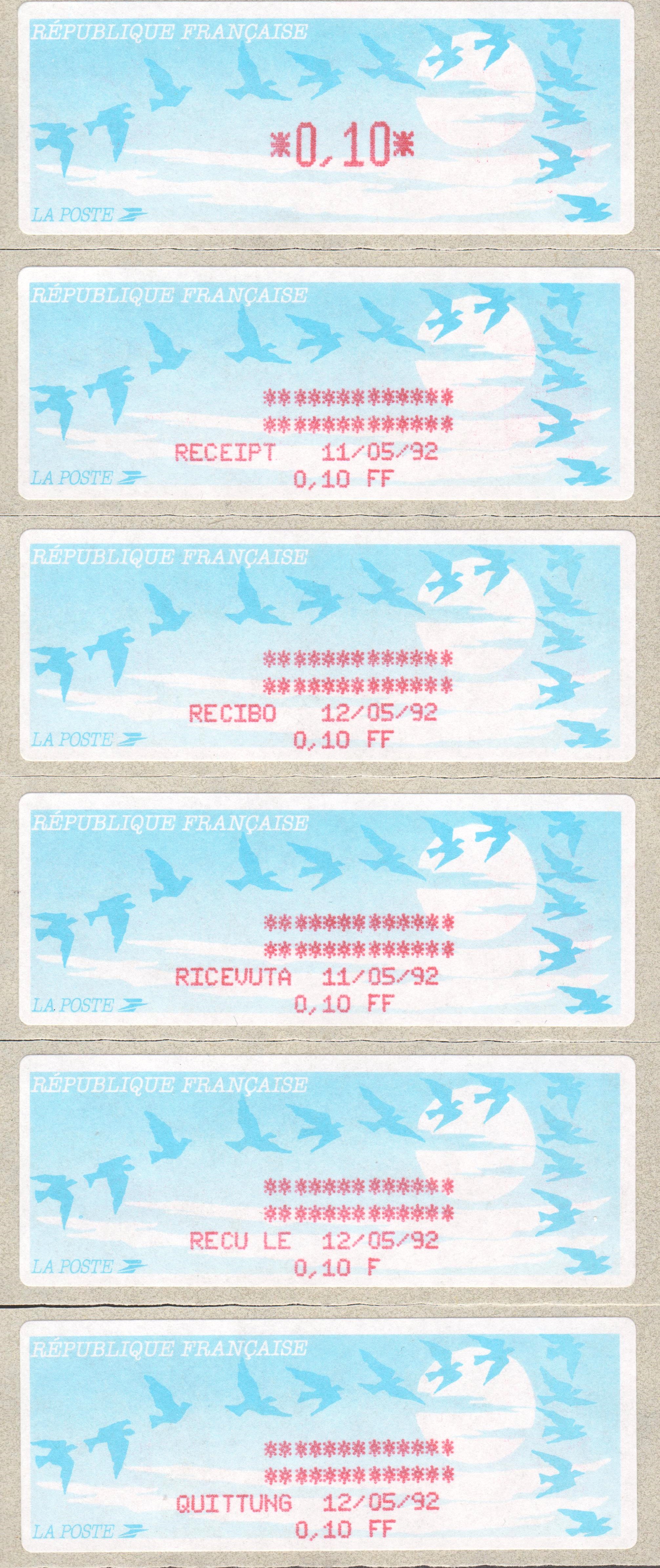 Frankreich 1990, Automatenmarke Type 11 II postfrisch sowie die dazu möglichen Varianten der Quittung aus dem Automaten, die je nach gewählter Bedienungssprache vom Automaten in 5 verschiedenen Sprachen ausgedruckt wurde!