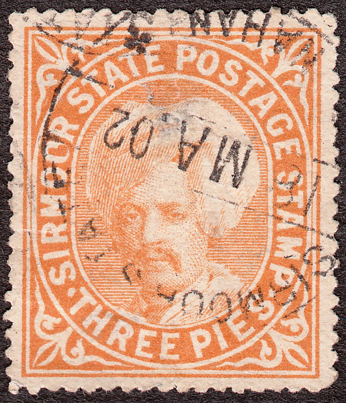 Diese 1888 erschienene Freimarke zu 3 Pies in orange zeigt ein Kopfbild von Radscha Sir Schamscher Parkash mit Turban: