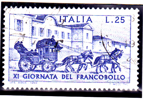 Auf der Marke zum Tag der Briefmarke 1969 aus Italien (MiNr 1302) vom 7.12.1969 ist eine vierspännige Postkutsche der Linie Sondrio-Tirano aus dem Jahre 1903 abgebildet.