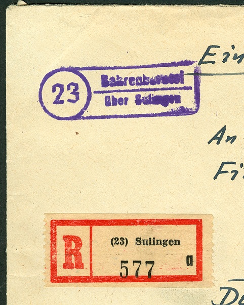 Auf einem Einschreibbrief des Jahres 1955 wurde dieser Gummi-Stempel abgeschlagen. Bahrenborstel über Sulingen.