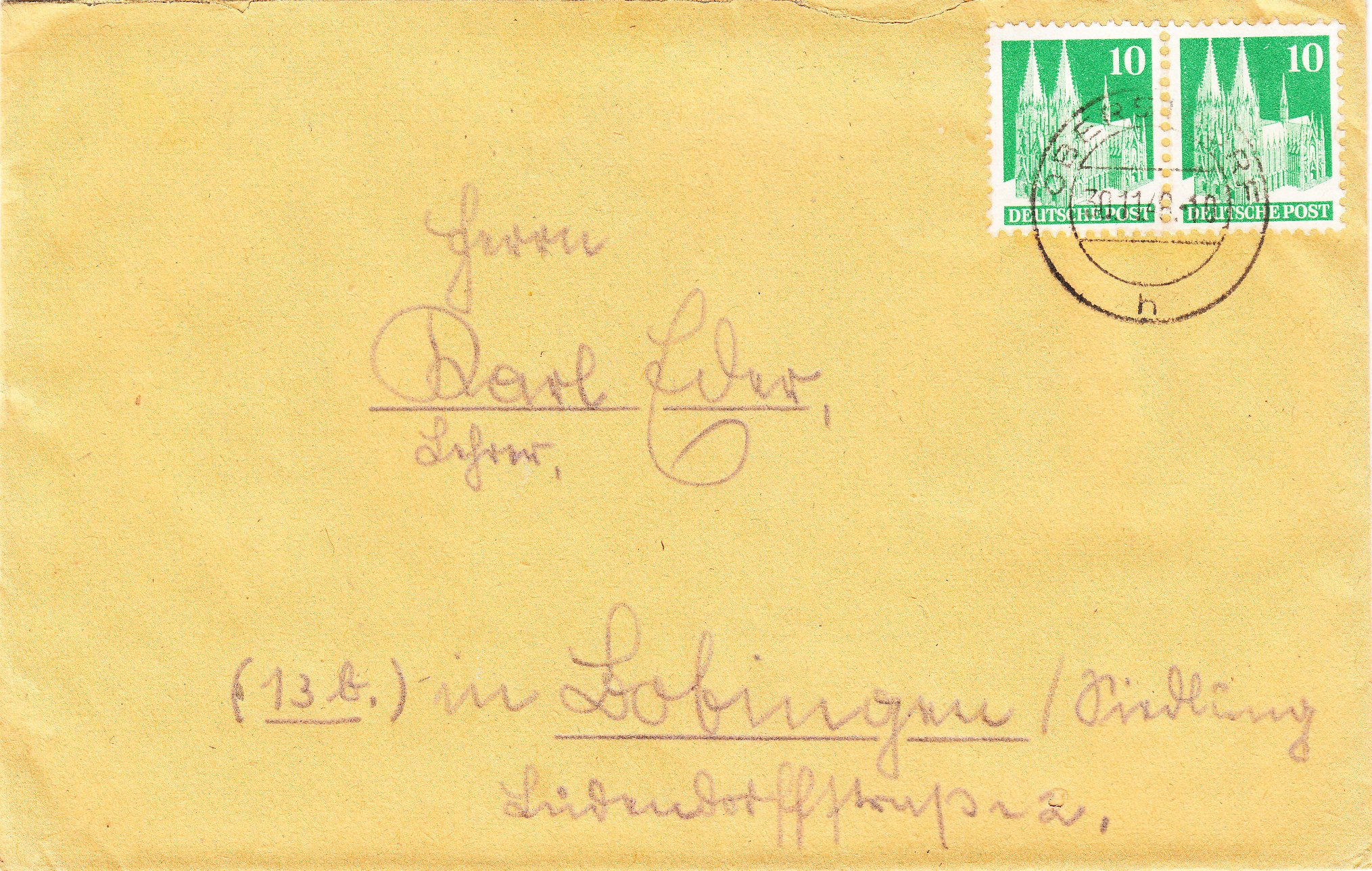 Diesen Brief im Fernverkehr vom 30.11.1948, frankiert mit einem Paar der MiNr. 80 in der Type V, erkennbar an der Schwelle im Seitenportal, habe ich gestern bei Tauschtag in Köln-Weidenpesch aus einer Grabbelkiste gezogen: