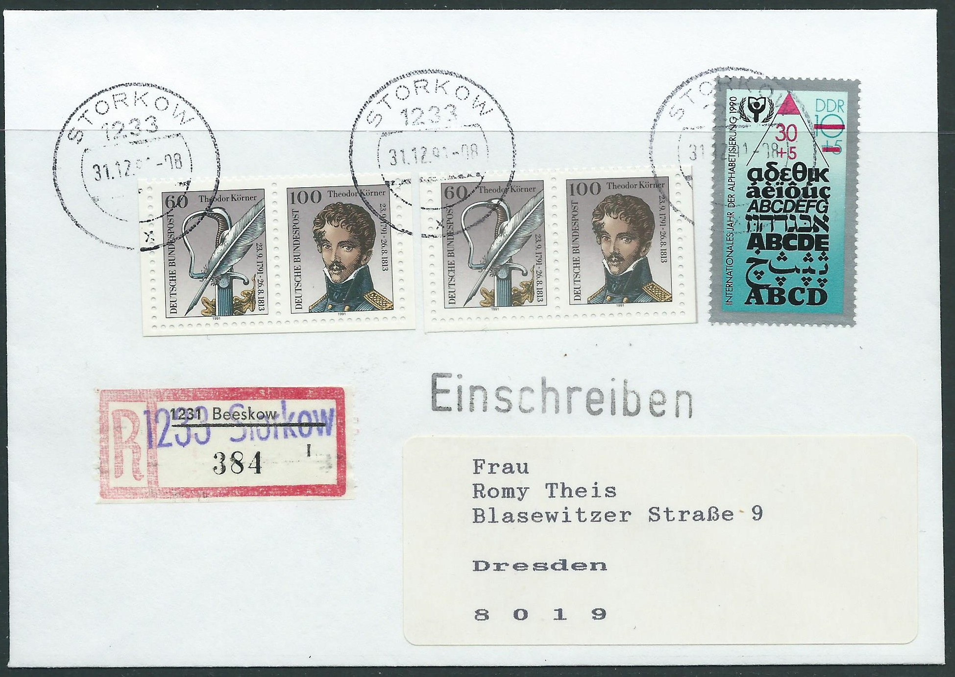 Das Nebensächliche hier ist noch die Frankatur: Mischfrankatur Bund (2 mal das Innenleben von Block 25) und DDR in DM-Währung (Mi.Nr. 3353), gestempelt in Storkow am 31.12.91. Somit ein Letzttagsbeleg für die DDR-Marke, die ab 1.1.92 ungültig wurde. Und da dieser Beleg etwas "philatelistisch beeinflusst" ist, liegt auch noch der Einlieferungsschein vor: