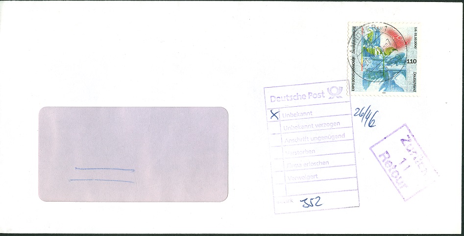 für die selbstklebende EXPO-Marke kann ich deine Beobachtung bestätigen. Sämtliche in meinem Briefe-Bestand befindlichen Belege sind davon betroffen. Hier nur drei Beispiele für Daten aus 2000 und 2001. Die Marken sind nur noch an der ehemaligen Position, weil die Belege in Hüllen untergebracht sind.