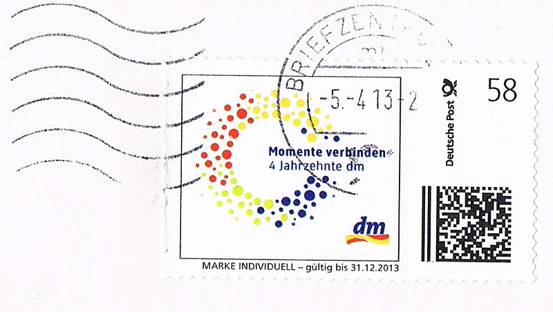 Auffällig der große Barcode auf der Marke. Wahrscheinlich wurde bei den Sortier- und Stempelungsanlagen tatsächlich hier die Marke auf ihre "Gültigkeit" überprüft.