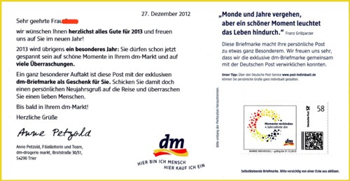 WER WEISS DENN SO WAS?Unter dem Bildmotiv "Briefmarken Individuell" finden sich meist Angaben, wie "www.marke-individuell.de", "MARKE INDIVIDUELL", "BRIEFMARKE INDIVIDUELL", "www.portocard-induviduell", "PORTOCARD INDIVIDUELL" und seltener auch mal keine Angaben. Mal links bündig, mal rechtsbündig zum Bild und mal in Kombination mit der Angabe "Deutsche Post". Wahrscheinlich habe ich jetzt noch nicht alle Angaben aufgezählt.
