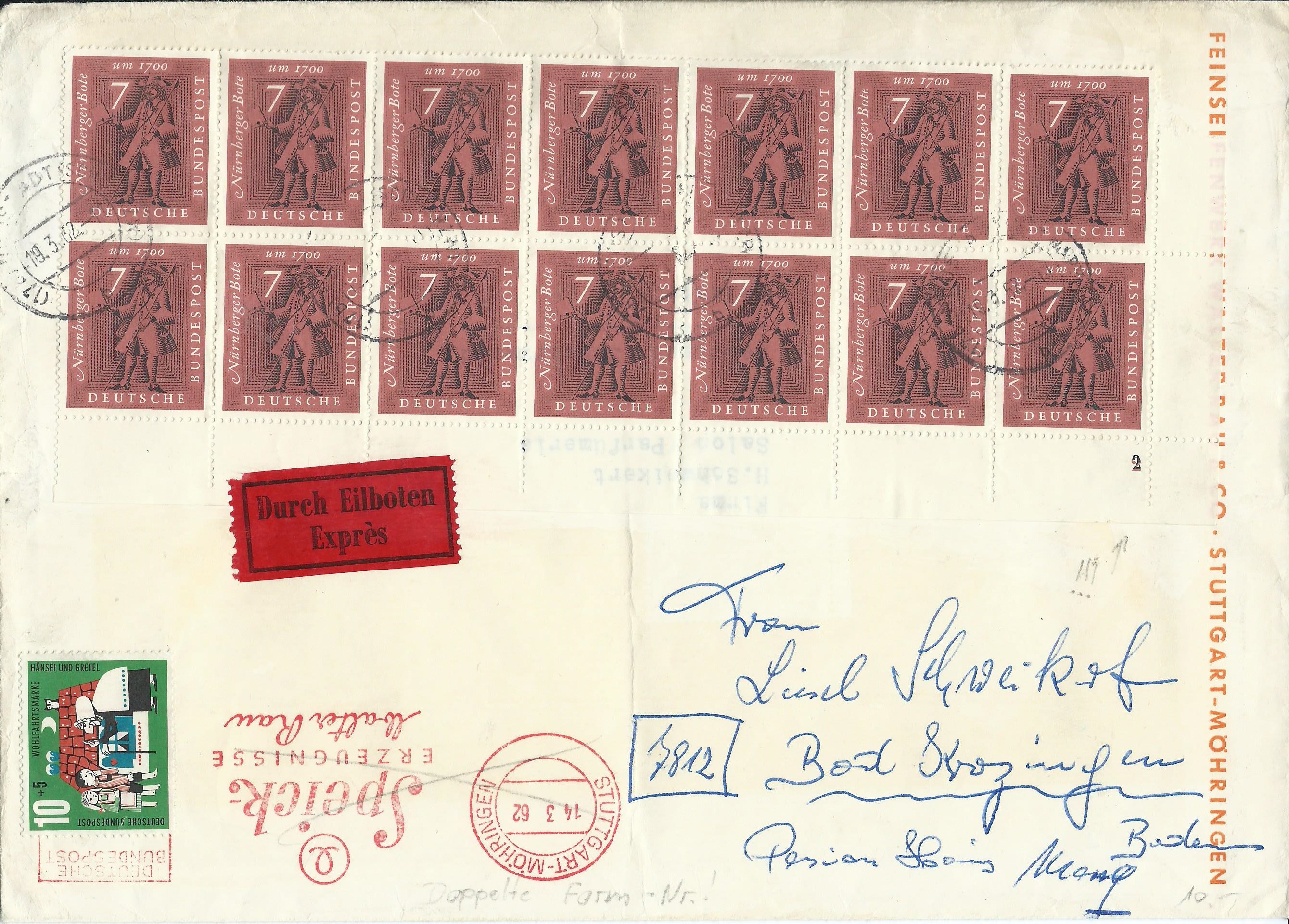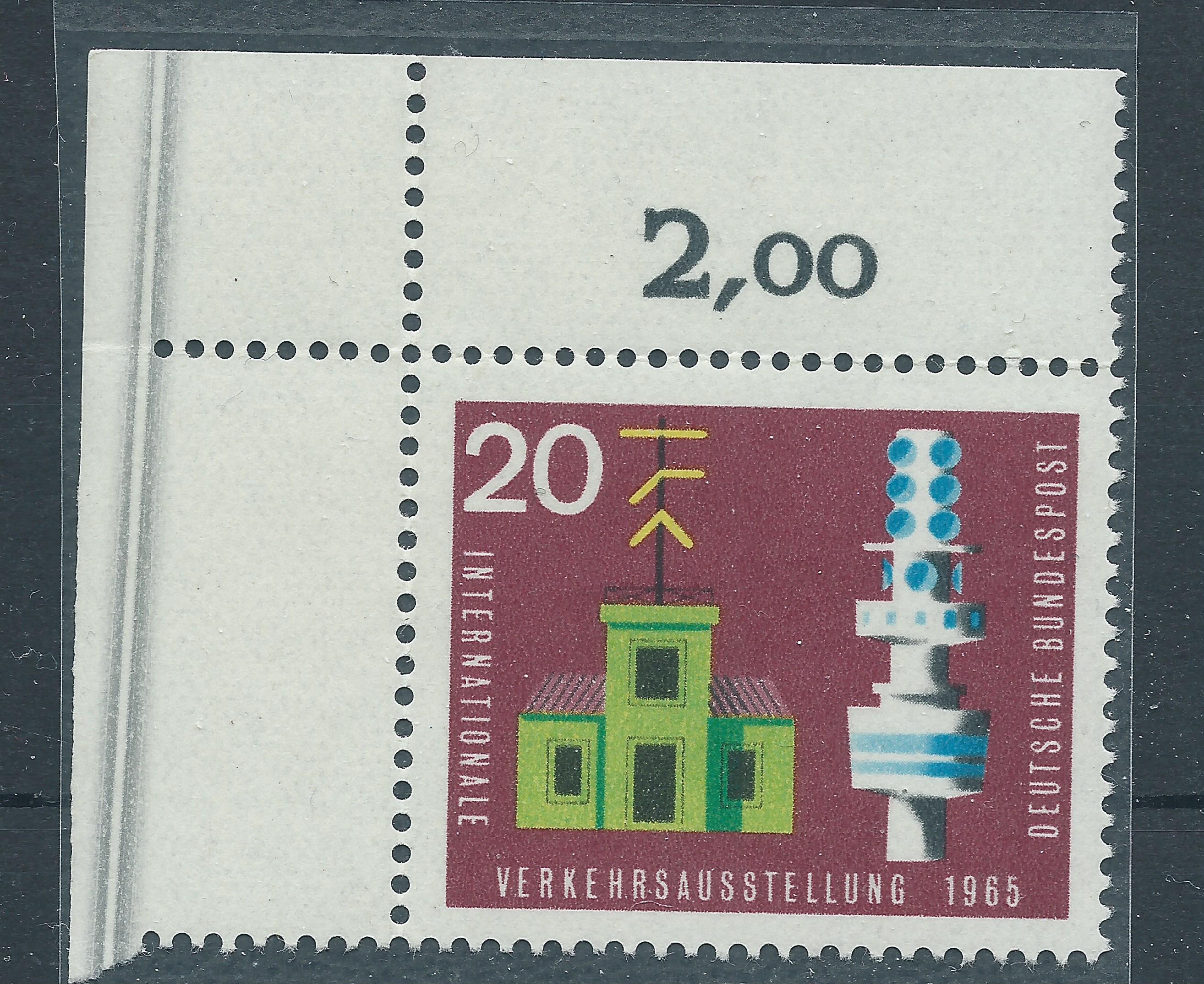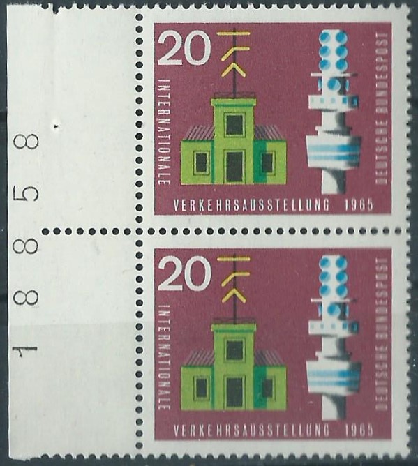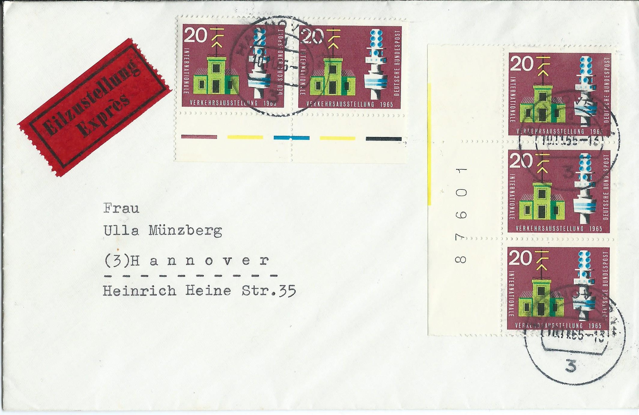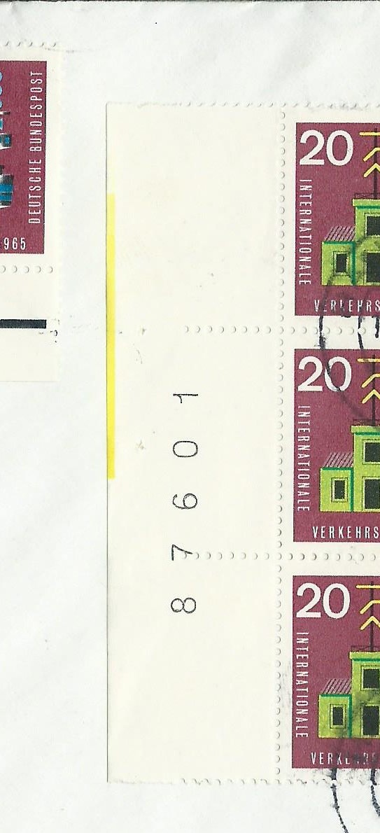 Heute habe ich ein ganz besonderes Stück vorzustellen: Vor einiger Zeit (siehe Beitrag hier im Thread vom 25. Apr 2017, 21:51) habe ich von dieser Marke (Bund Mi.Nr. 471, Verkehrsausstellung 1965 20 Pf) ja schon ein postfrisches Eckrandstück links oben erwischen können, auf dem ein bis heute noch nicht identifizierter Zudruck in Form eines breiten Striches zu sehen ist. Von der gleichen Ausgabe ist mir kürzlich bei ebay ein Beleg aufgefallen, den ich eigentlich erst gar nicht näher ansehen wollte, da ich die Besonderheiten der Farbstriche am Unterrand und der Bogenzählnummer links senkrecht am Rand schon in der Sammlung habe. Irgendwie hatte ich aber dann doch die Eingebung, mir den Beleg mal genauer zu betrachten und siehe da: Da war tatsächlich etwas, was ich noch nicht kannte! Links neben der Bogenzählnummer ist noch ein senkrechter gelber Strich sichtbar! Bei dieser Marke sind mir aber nur die farbigen Striche unten (linker Frankaturteil) bekannt und keine weiteren am senkrechten Rand. Somit hatte der Beleg mein Interesse geweckt und ich habe ein entsprechend hohes Gebot abgegeben. Für 15,05€ bekam ich dann auch den Zuschlag und habe mich wahnsinnig gefreut. Heute wurde die Freude noch grösser, denn der Brief lag im Kasten und ich habe ihn sofort ausgiebig betrachtet sowie hier für das Forum eingescannt.